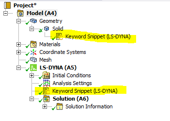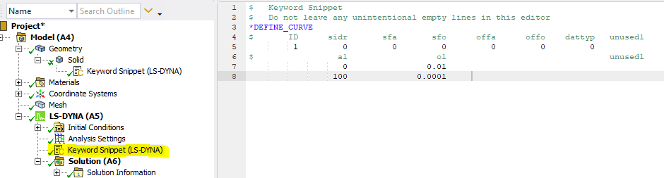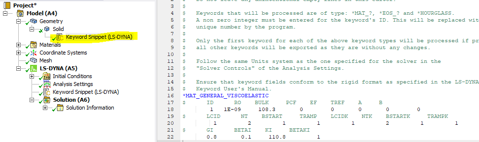 However, if the strain rate-dependence is defined as multiple stress-strain curves, you need to use Keyword Snippet in Mechanical GUI. The Snippet is inserted under the body in Geometry to replace the default material assigned to the body. In the keyword snippet, you need to enter the material data in exactly the same format as defined by LS-DYNA Keyword Manual. See attached pictures below.