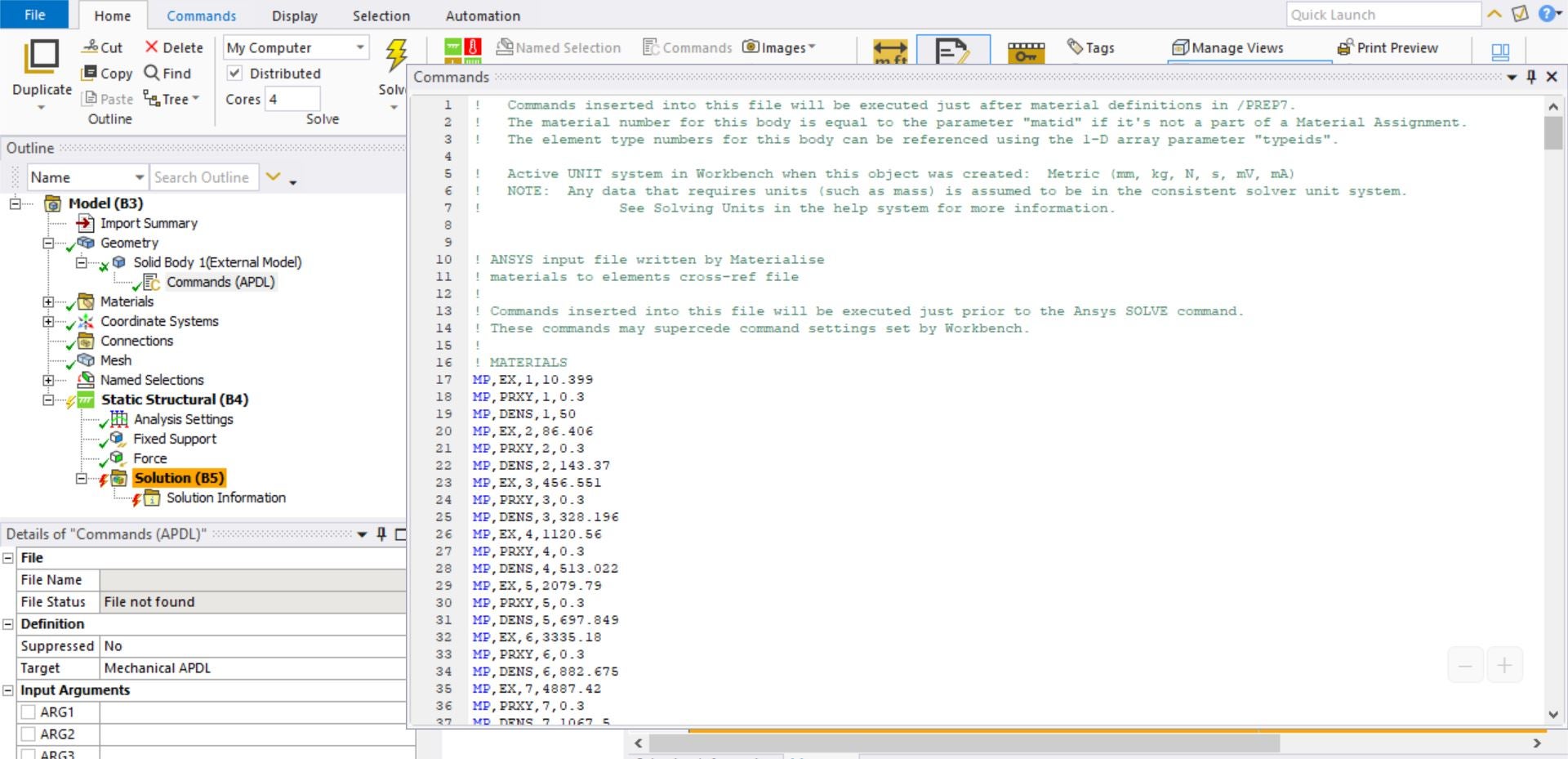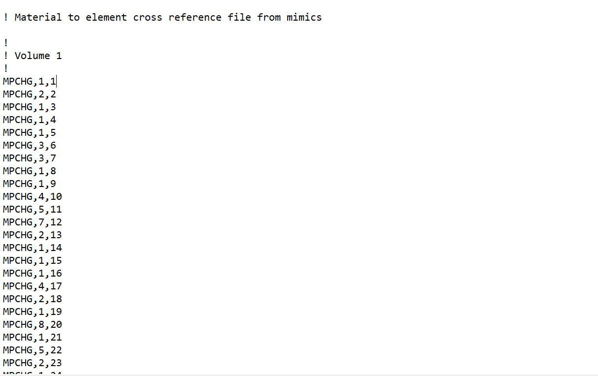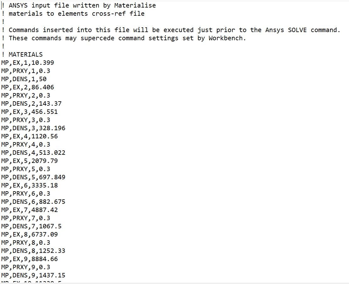 I have a human bone geometry which I meshed on mimics and then imported it to ansys. The mesh imported successfully but I also mapped anisotropic material properties of bone on mimics but I cannot import these properties on ansys mechanical. Mimics clearly states that these files are being exported for ansys. Mimics gave me a .txt file for material properties which I cannot import in ansys. The text file contain data in this format: