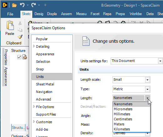 spaceclaim can't support in specific size when it’s come to nmÂ