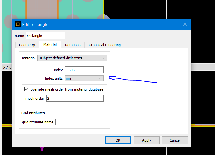 • INDEX UNITS: Only relevant when specifying a spatially varying equation in the INDEX properly described above. Specify the units (nm, um, m) of the x,y,z position variables.
