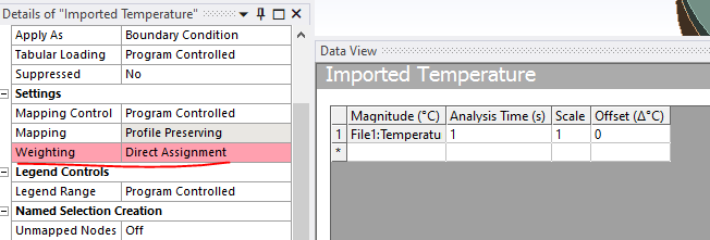 However, I cannot use this external data as input for the temperature boundary conditions because the imported temperature cannot be applied because Direct Assignment weighting is not supported.