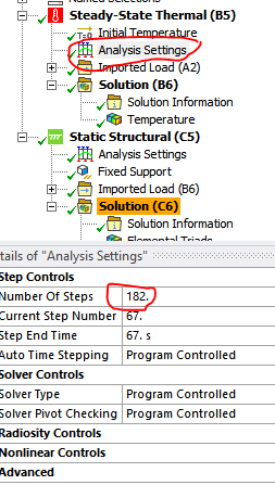 Now back to the mechanical environment the analysis settings for both thermal and the static structural should be set to 182 steps