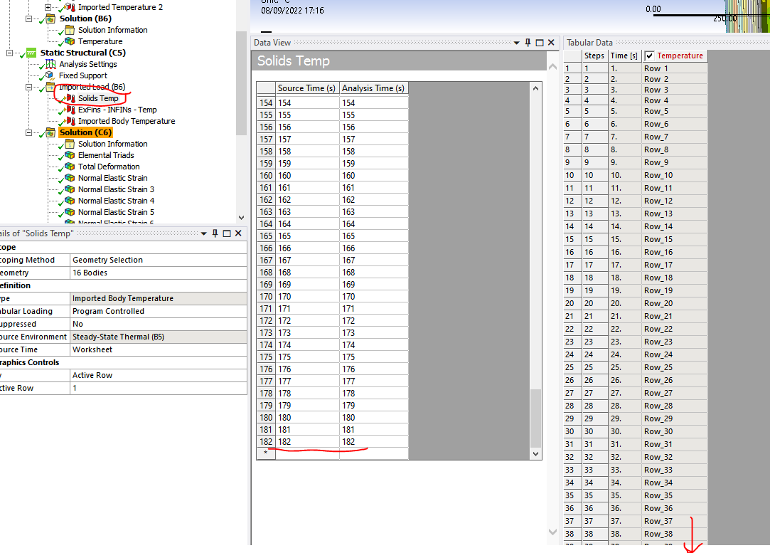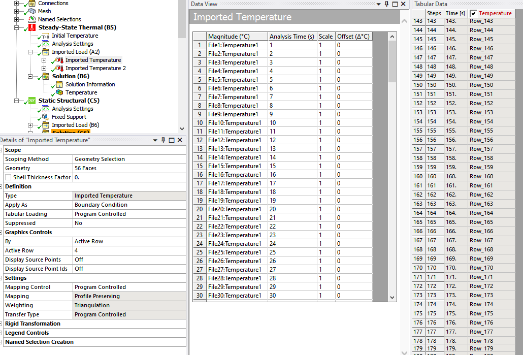 I would like to simulate a thermoelastic problem on Ansys workbench. I have externally determined temperatures that I want to input as boundary conditions in a steady state thermal simulation. For each time step, I have several temperatures to input for the thermal simulations, so for each timestep I can copy the temperature in the tabular environment, like in the picture.