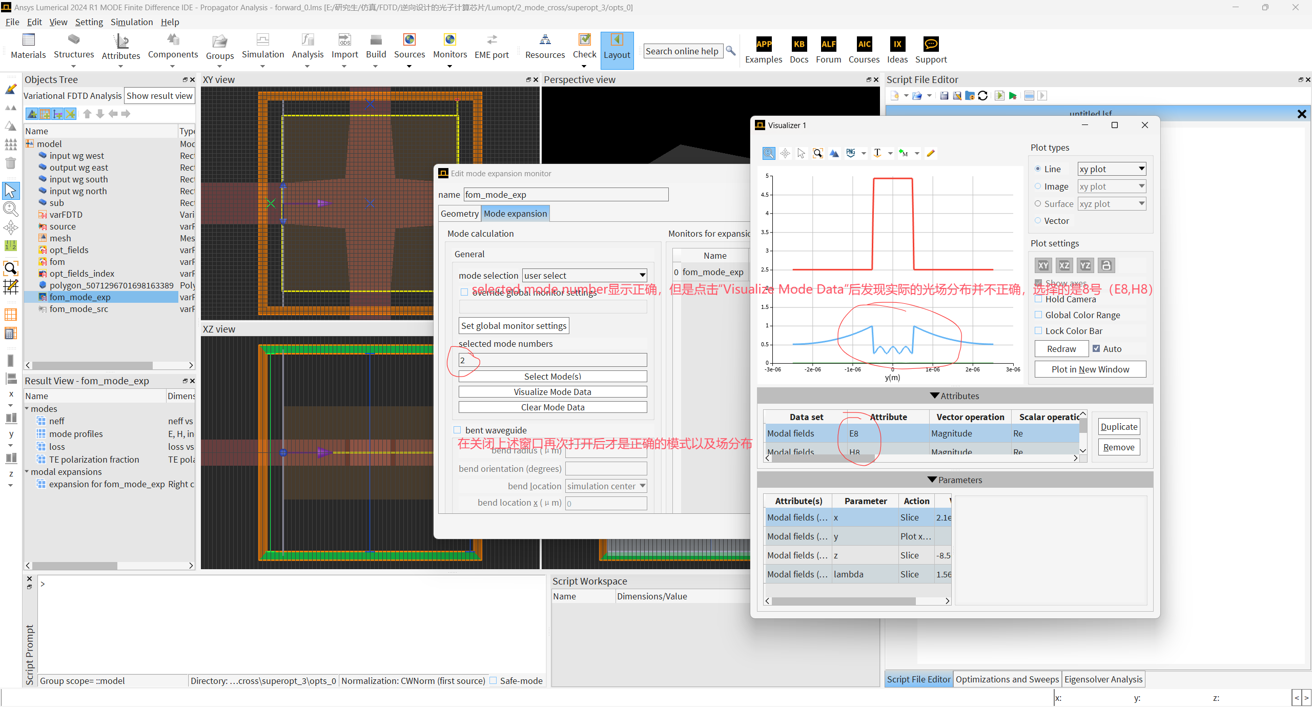 Subscriber您好老师,我在参考官网的案例“Inverse design of waveguide crossing ”进行相关设计时,遇到了一个问题:在varfdtd的优化时,我所选的模式序号和仿真实际生成的模式序号不对应,或者所选序号正确,但实际的光场分布却是错误的,我怀疑是这个原因导致优化无法进行下去。具体如下: