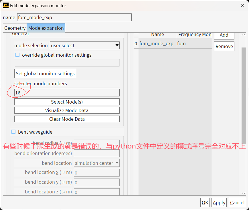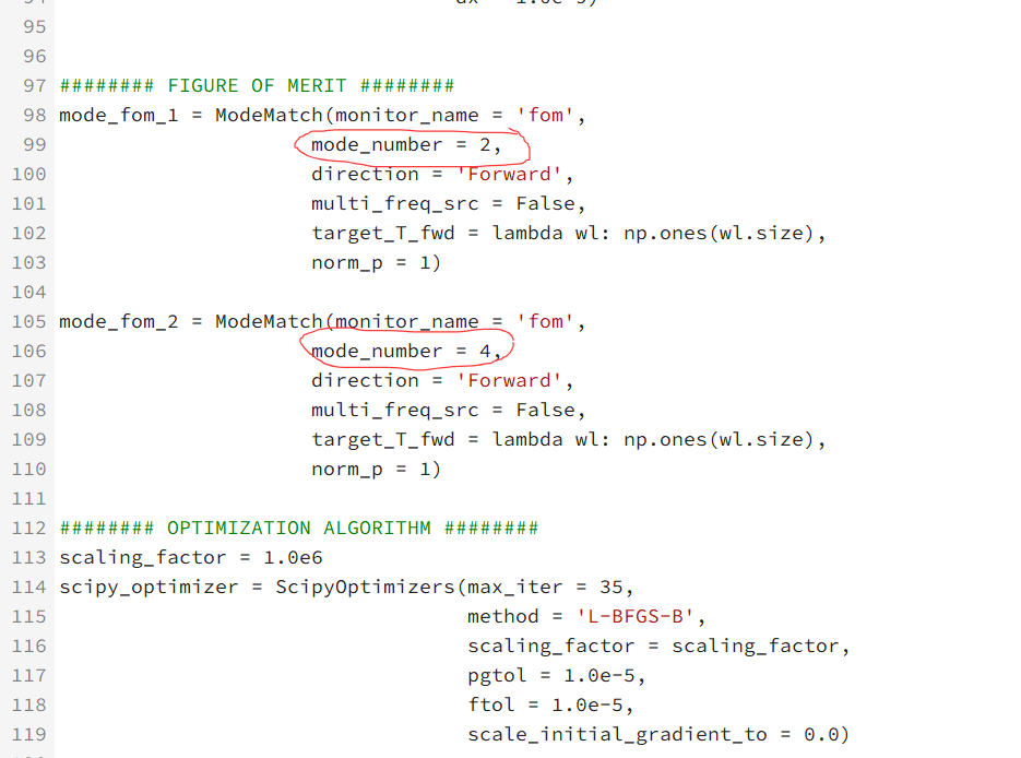 我想实现一个同时适用于TE0和TE1模式的波导交叉,在原案例的基础上,将输入输出波导的宽度改为了1微米,并且取消了对称边界条件。其余的参数也做了相应的匹配。在选择输入模式光源的模式序号时应选择2(TE0)或者4(TE1),为了查看输出端对应的模式序号,预先在fom监视器的位置添加了一个同样大小的mode expansion模式扩展监视器(在实际运行优化时,已注释掉),发现对应的模式序号仍为2(TE0)或者4(TE1)。在实际的python优化文件中,fom的mode_number选择的也为2或者4。设置好后运行仿真,发现仿真在初始化后就立即结束了。打开生成的仿真文件,发现自动生成的fom_mode_exp监视器中所选的模式序号与python文件中所定义的模式序号对应不上,或者说所选序号是正确的,但是在查看光场分布时,却是错误的。需要关闭界面重新打开后,方才为正确的模式序号及场分布。但是在优化过程中,我怀疑优化器选择的是错误的模式序号,从而导致优化过程无法进行。具体的截图分别如下。我在仔细检查了代码后,并未发现错误。请问老师,这种情况是什么原因导致的呢?应该如何处理呢?