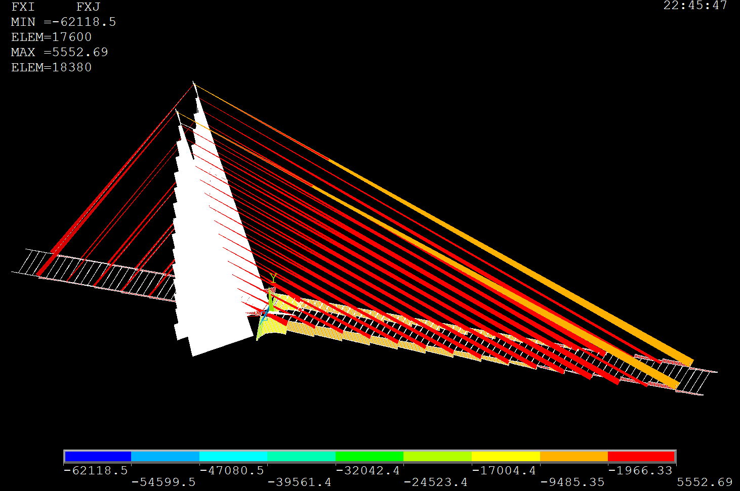 When I plot FXI and FXJ the longest link element still seems to be taking a compressive load as its colour is within the -1966 to -9485 kN range. Am I using SECCONTROL incorrectly or is there some issue with my plot? All I did was make an etable with FXI and FXJ and then plot it with PLLS. The compressed cables are definitely the correct section since I can select them with the section ID.
