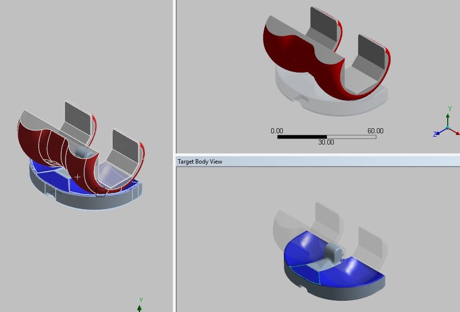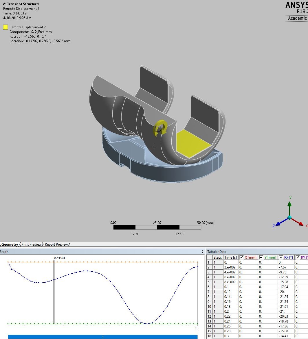 I want the knee to have some sort of kinematics,so I've set up a remote displacement on my femoral component, and have everything fixed except the translation in the z-direction (free), and rotation in the x-direction (input gait data). I've also placed a remote displacement on the bottom part, and fix it in all but one-direction (it can move up and down). I've put a force on the bottom of this, and have it set to push up (to simulate the force of someone walking).
