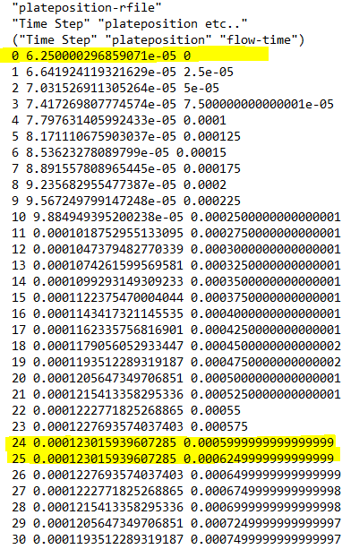 From the collected position of the plate, i noticed that at t=0, the plate is not exactly at the known center of gravity of 6.25e-5 m and the plate has the same position (1.23e-4 m) for 2 consecutive times step (24 & 25).