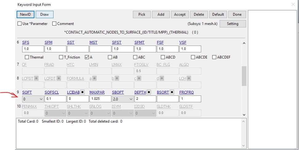 SOFT=1Â andÂIGNORE=2Â (Optional Card C). - For contact of sharp-edged surfaces, setÂ
