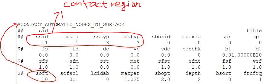 SOFT=2 on Optional Card A.  SOFT=2 is also referred to as segment-based contact and so is not applicable to any NODE_TO_SURFACE type contacts. Two important companion variables to SOFT=2 are SBOPT and DEPTH.Two important companion variables to SOFT=2 are SBOPT and DEPTH.