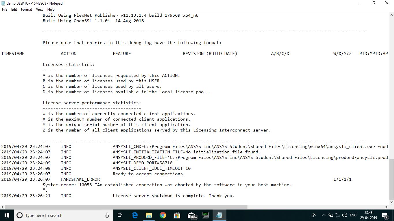 2019/04/29 22:51:22Â Â INFOÂ Â Â Â Â Â Â Â ANSYSLI_CMD=C:Program FilesANSYS IncANSYS StudentShared FilesLicensingwinx64ansysli_client.exe -nodaemon -demo -log C:UsersNEHAA~1AppDataLocalTemp.ansysdemo.log