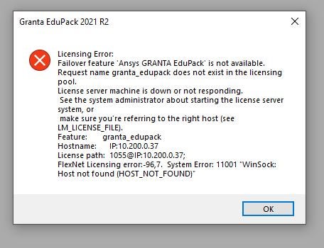 I am a student and I got this Granta Edupack version supplied to me by my institution 'edupack_setup.2021_R2' and the VPN 'OpenVPN Connect'. I managed to install the Edupack and the VPN. With the VPN connected, I open Edupack and I get this error: