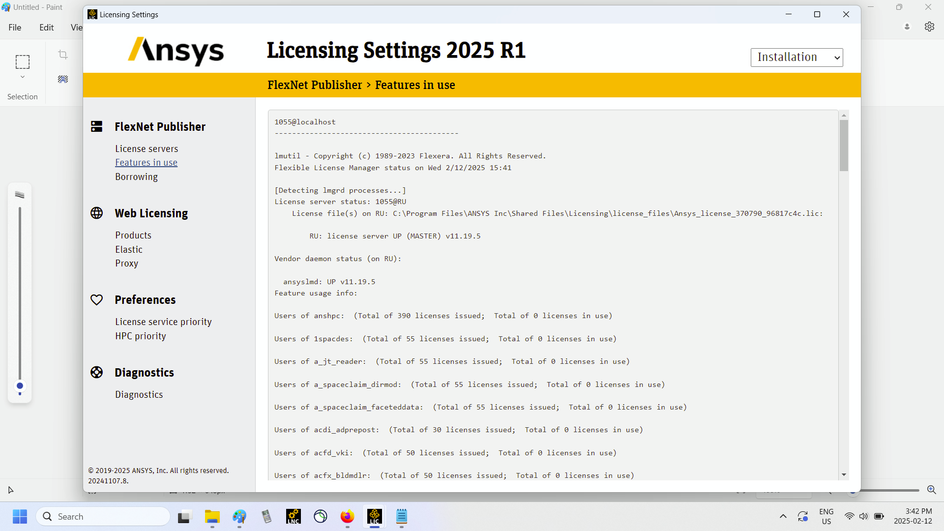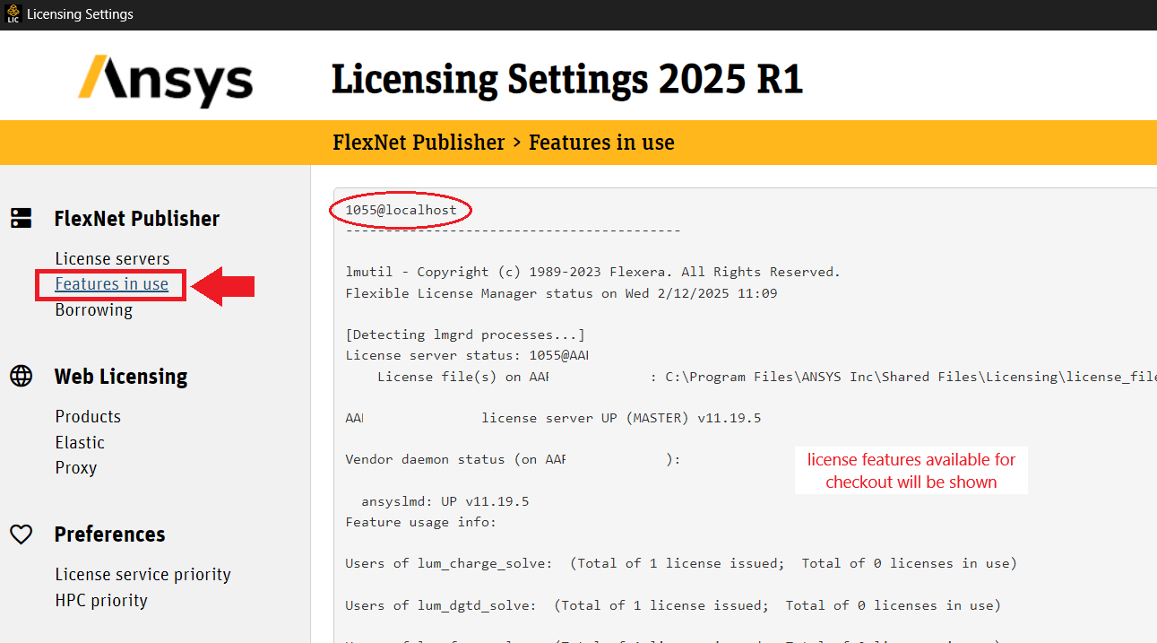 3. Send a screenshot of the Ansys licensing settings > FlexNet Publisher > Features in use page (similar to the image below).