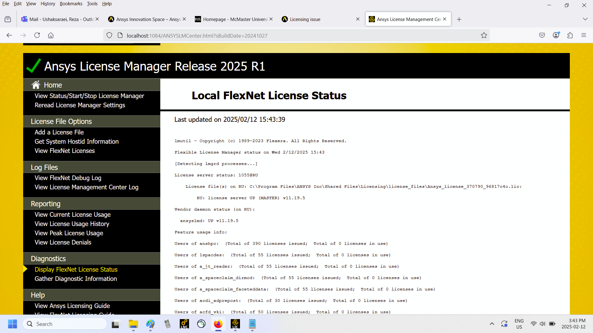 4. Also send a screenshot of the Ansys license management center > Display FlexNet license status page showing the licenses available for checkout –  see this KB for details and this screenshot/image.