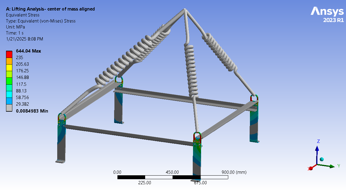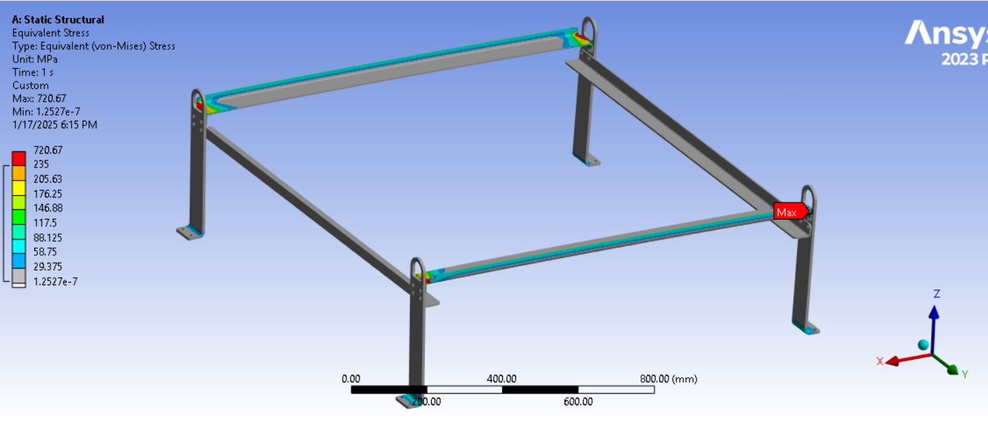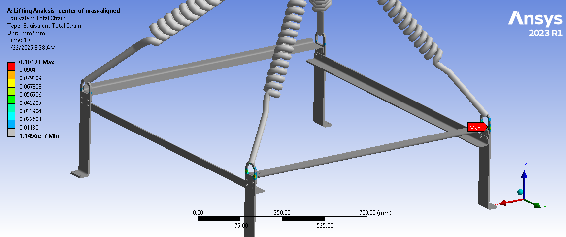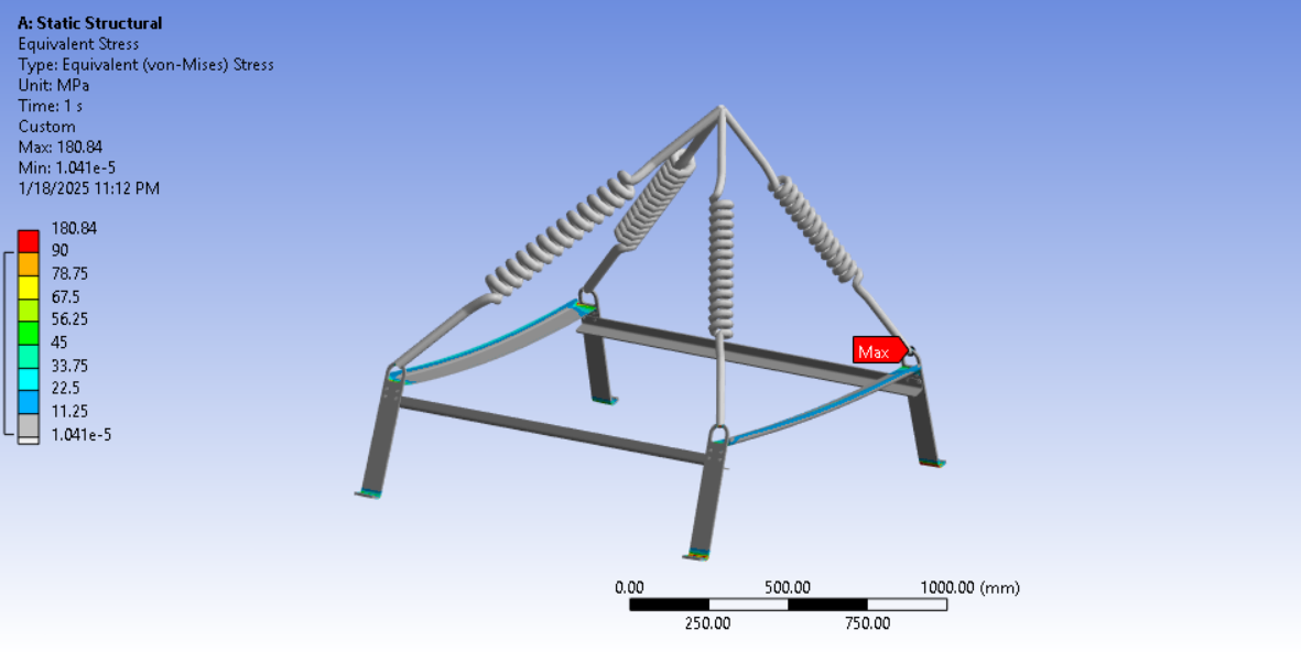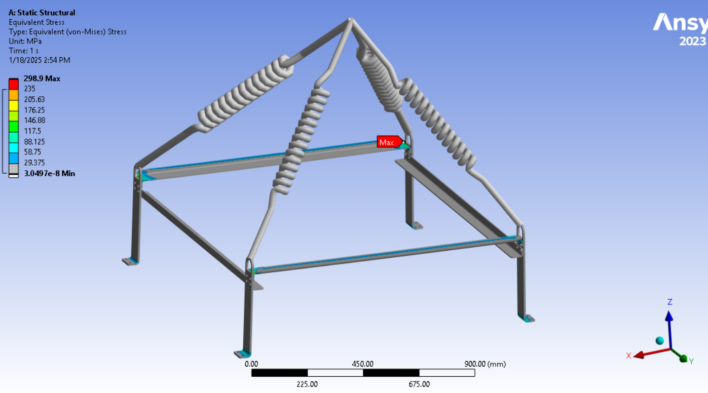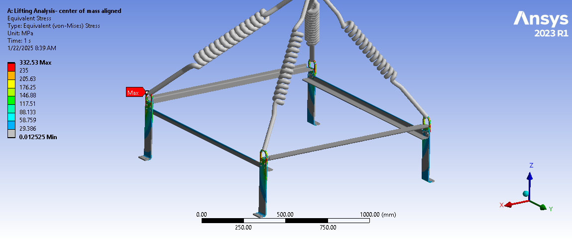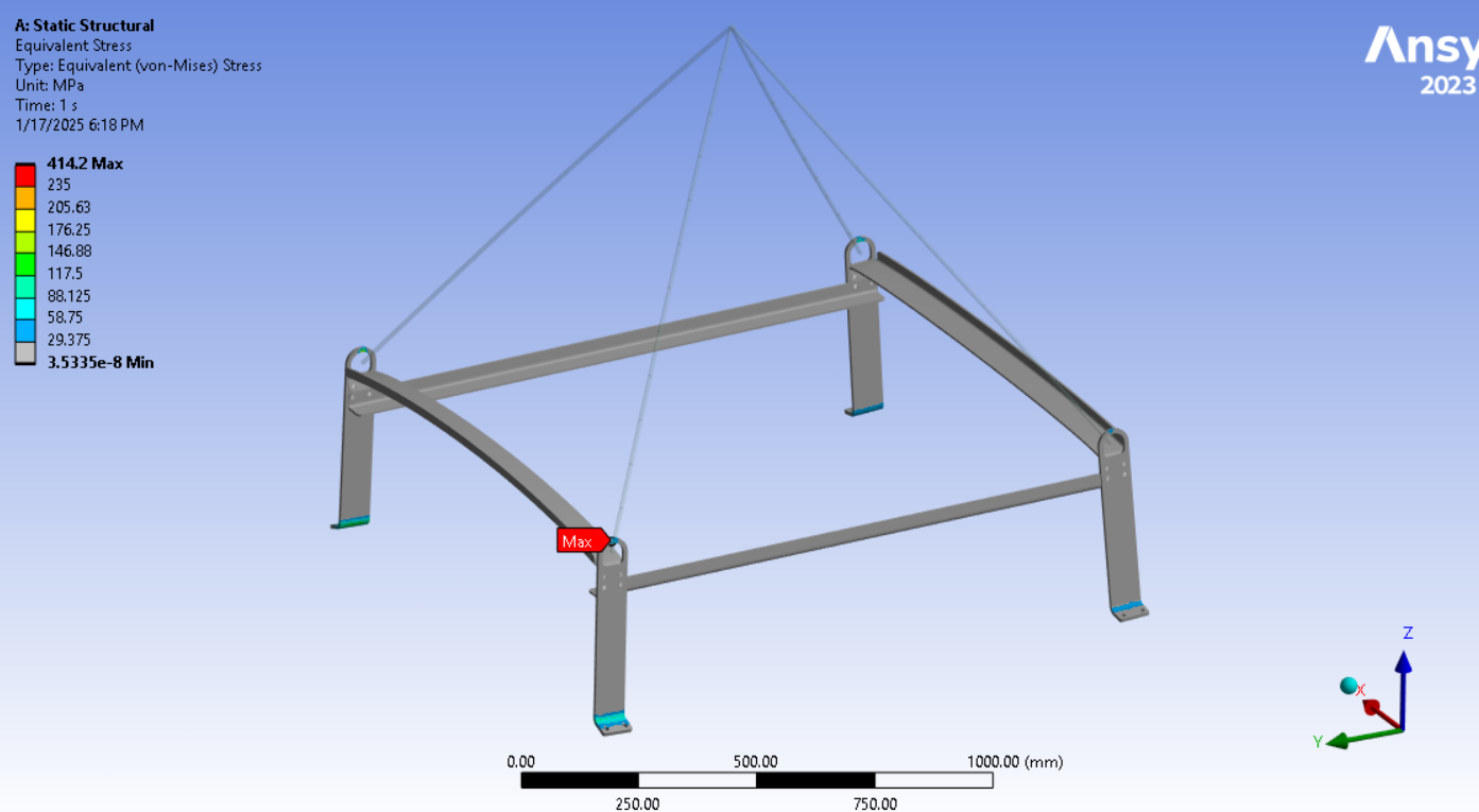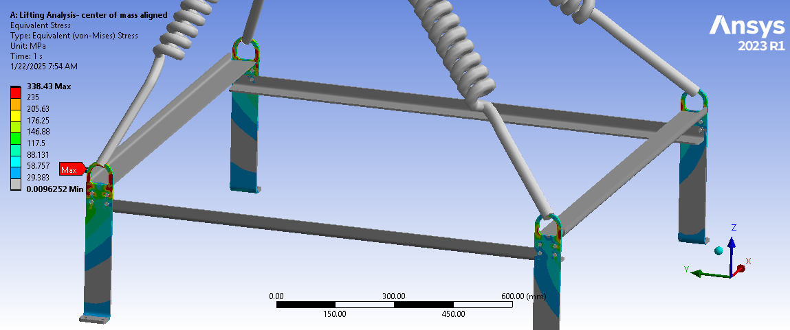 Looking at the last image, a significant surface area of the tips of the legs below the spring connection has and Equivalent Stress above the red contour threshold of 235 MPa. Is that the yield strength of the material? Do you need to maintain a Factor of Safety on the yield strength? A common value for lifting structures is a Factor of Safety of 3.0. In that case, you can divide the 235 value by 3 and type in 78 MPa. It looks like some redesign is needed.