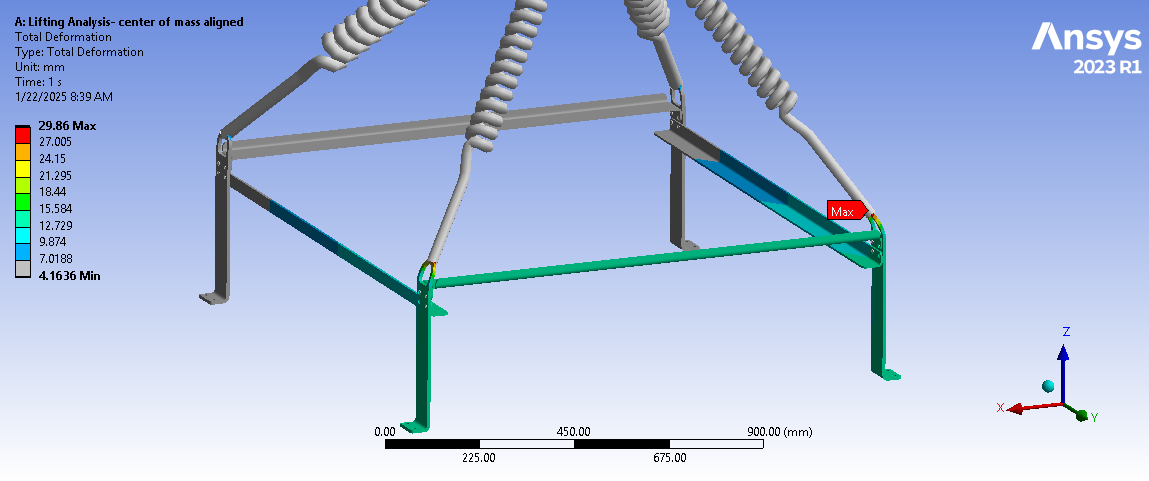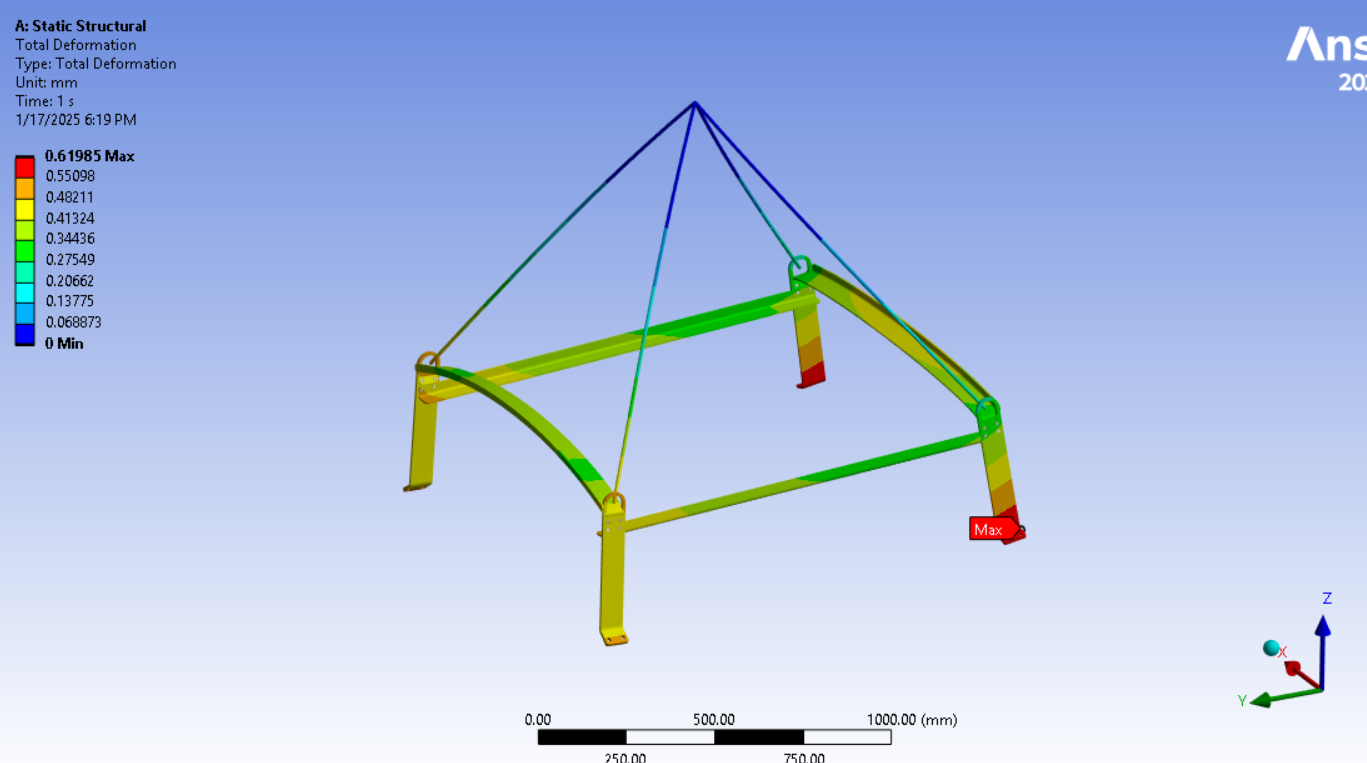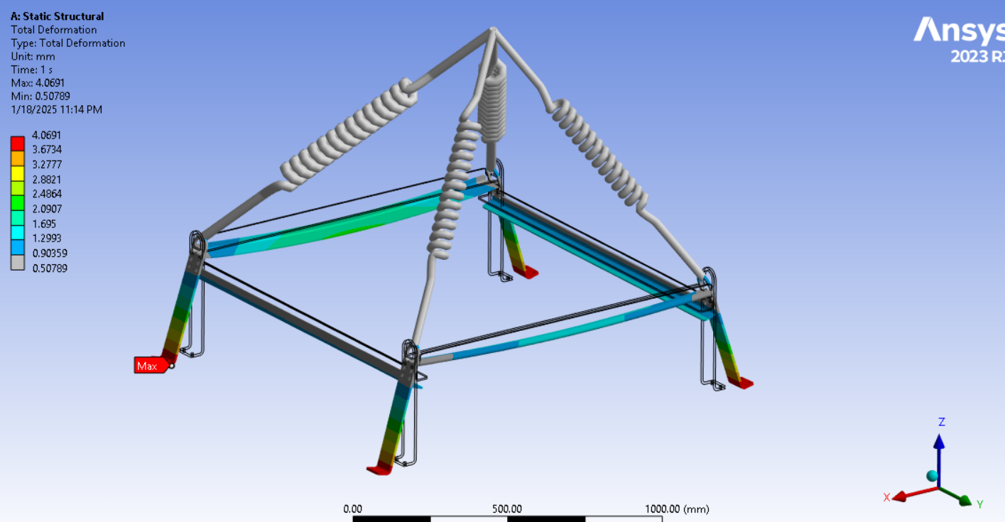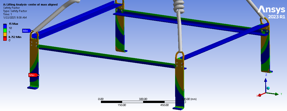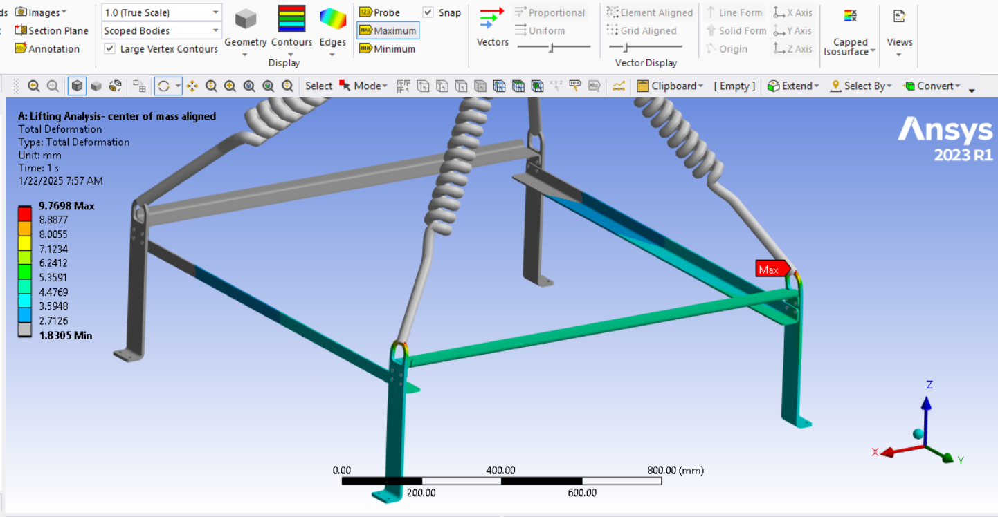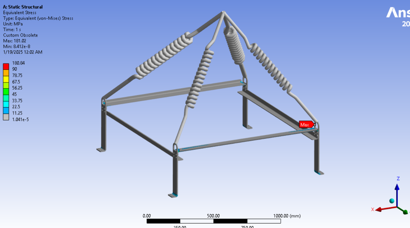 Looking at the last image, a significant surface area of the tips of the legs below the spring connection has and Equivalent Stress above the red contour threshold of 235 MPa. Is that the yield strength of the material? Do you need to maintain a Factor of Safety on the yield strength? A common value for lifting structures is a Factor of Safety of 3.0. In that case, you can divide the 235 value by 3 and type in 78 MPa. It looks like some redesign is needed.