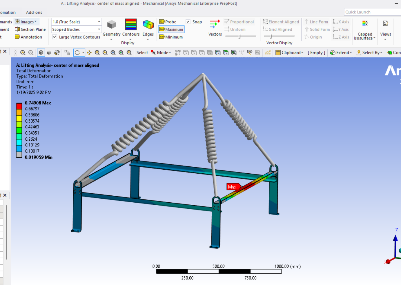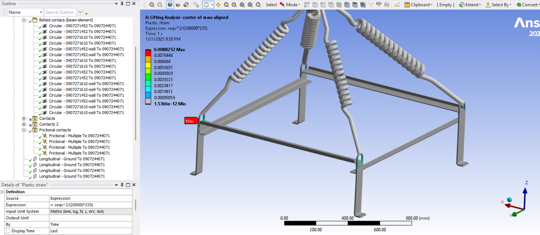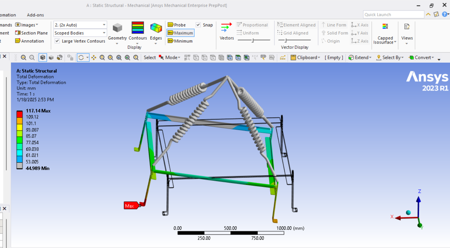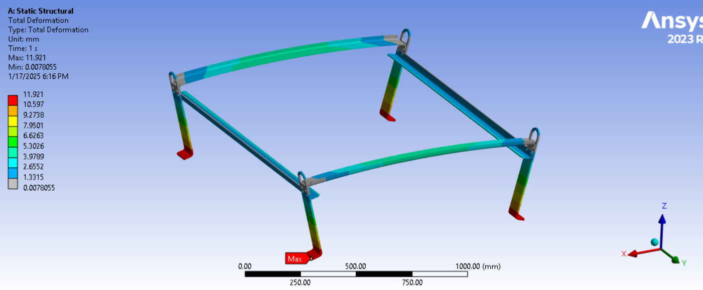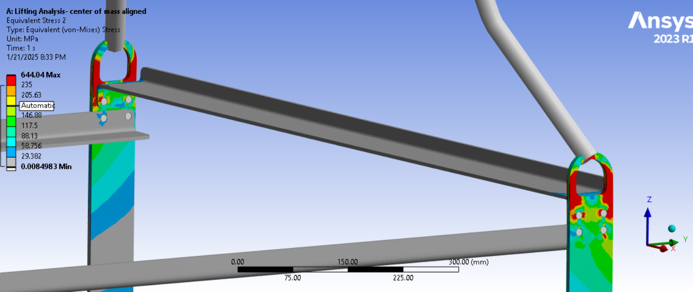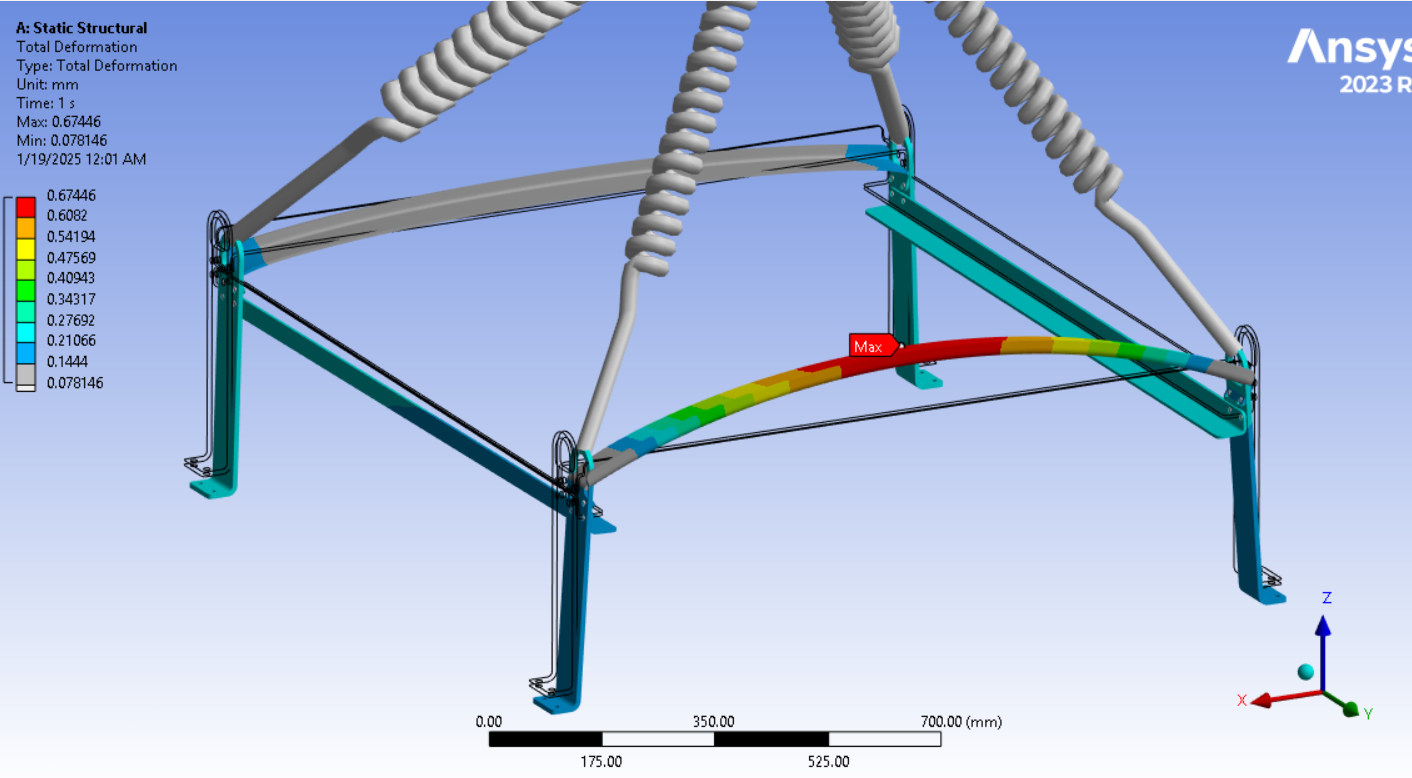Looking at the last image, a significant surface area of the tips of the legs below the spring connection has and Equivalent Stress above the red contour threshold of 235 MPa. Is that the yield strength of the material? Do you need to maintain a Factor of Safety on the yield strength? A common value for lifting structures is a Factor of Safety of 3.0. In that case, you can divide the 235 value by 3 and type in 78 MPa. It looks like some redesign is needed.