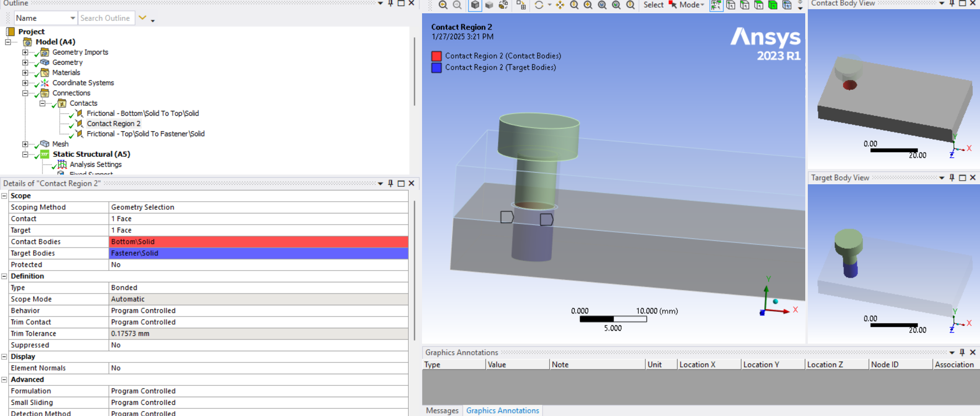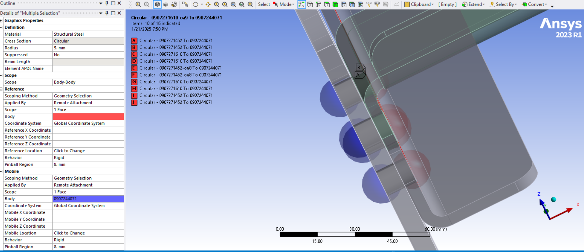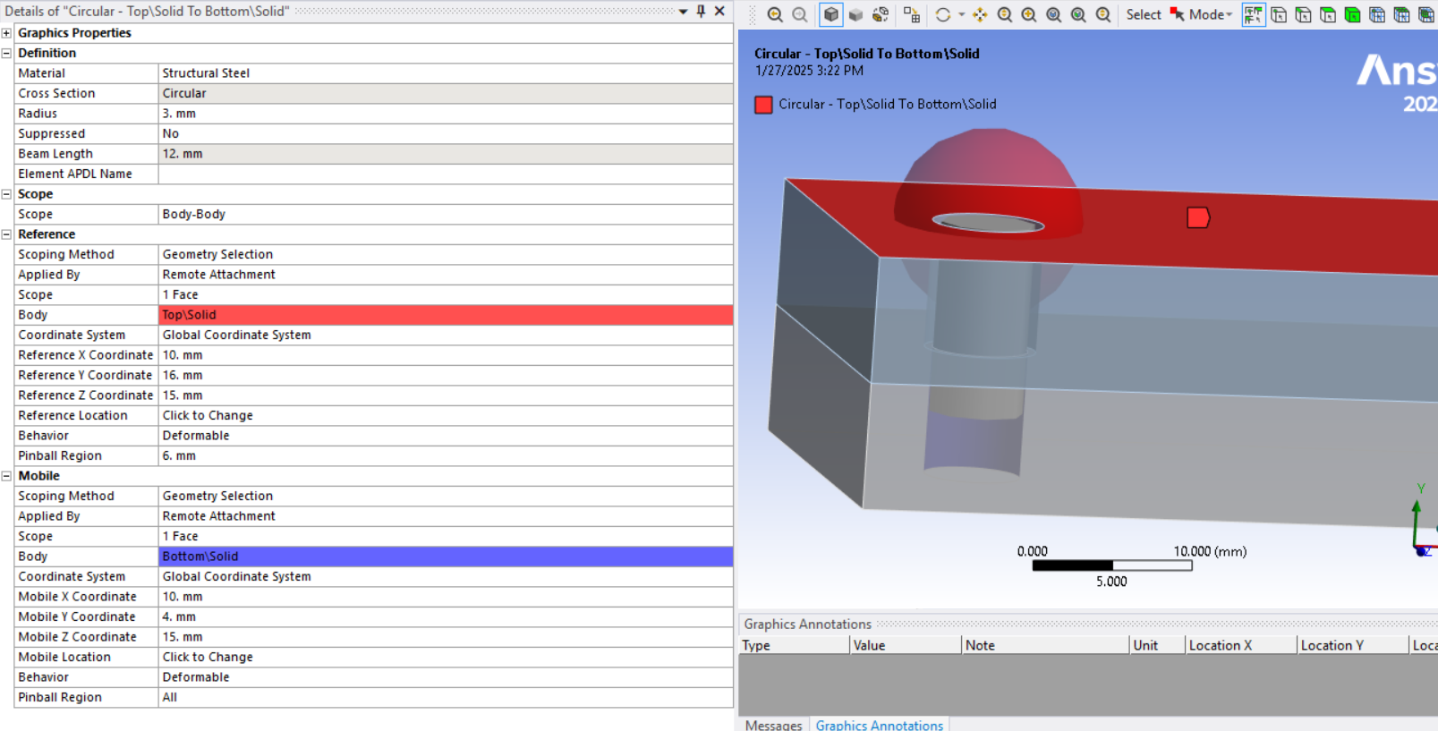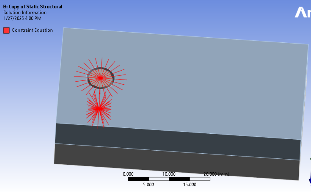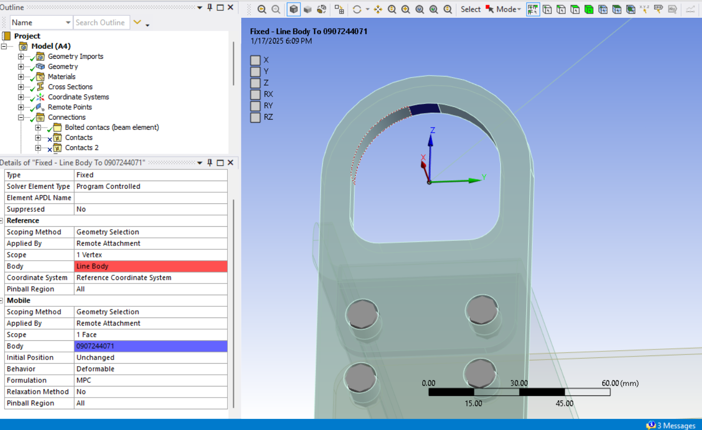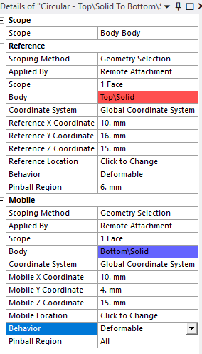 SubscriberPinball radius is a great time saver over imprinting circles on faces. Just need to make sure that the element size around the edge of the hole is well controlled to spread the load the way you want. You can visualize the connection elements after solution by clicking on the Solution Information folder and then click the tab at the bottom of the main window to Geometry.