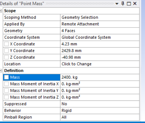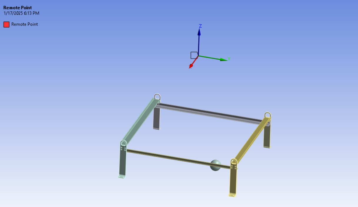 SubscriberYes the remote mass which is actually a table is complex to model, that frame will lift the table weighing 1200kg scoped to the four feet at the bottom of the structure and it will be bolted. I have now changed point mass to rigid as it was set deformable earlier. Could you check now the deformation is fine? stresses are same they haven't changed.