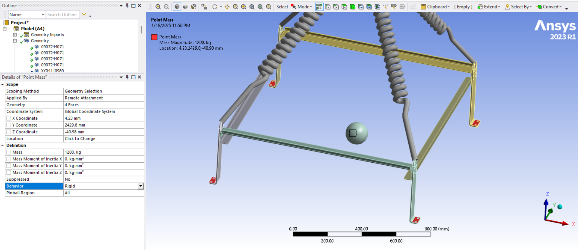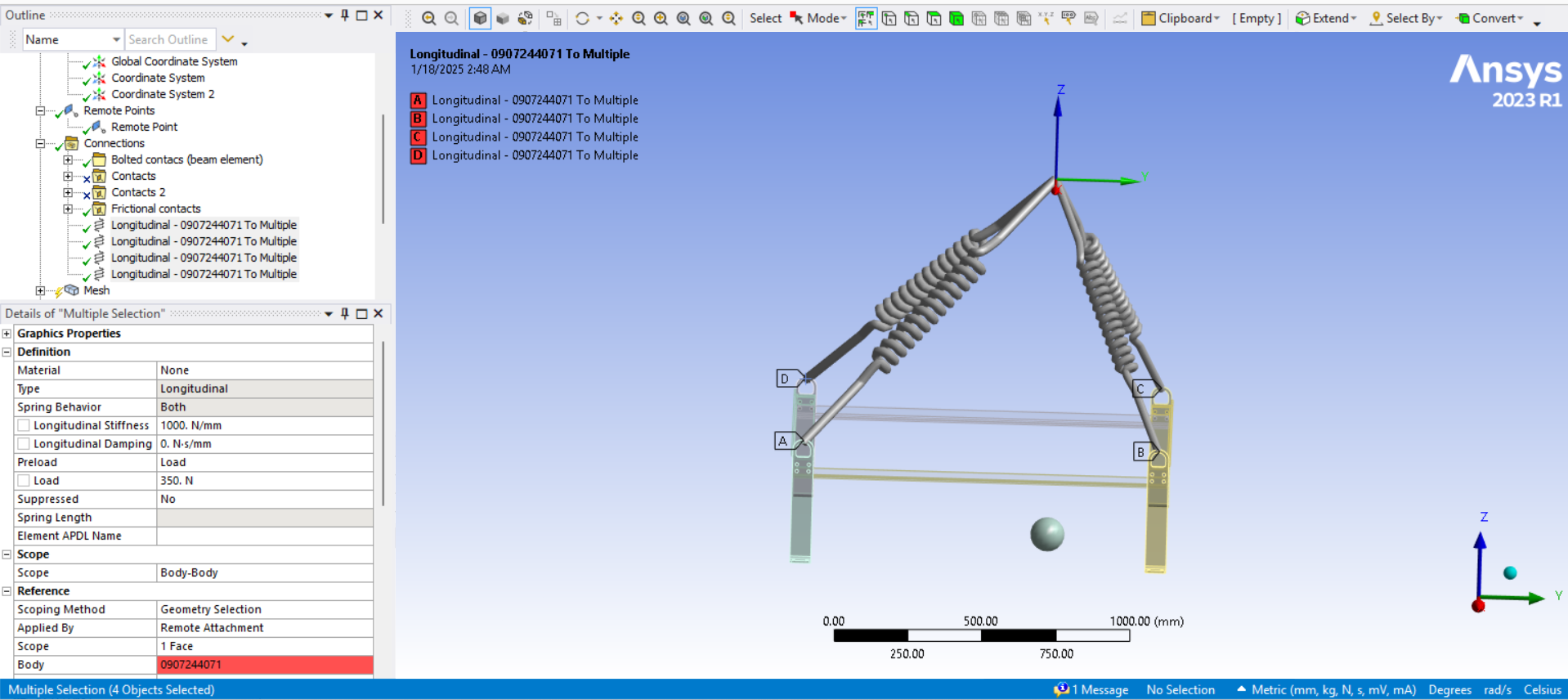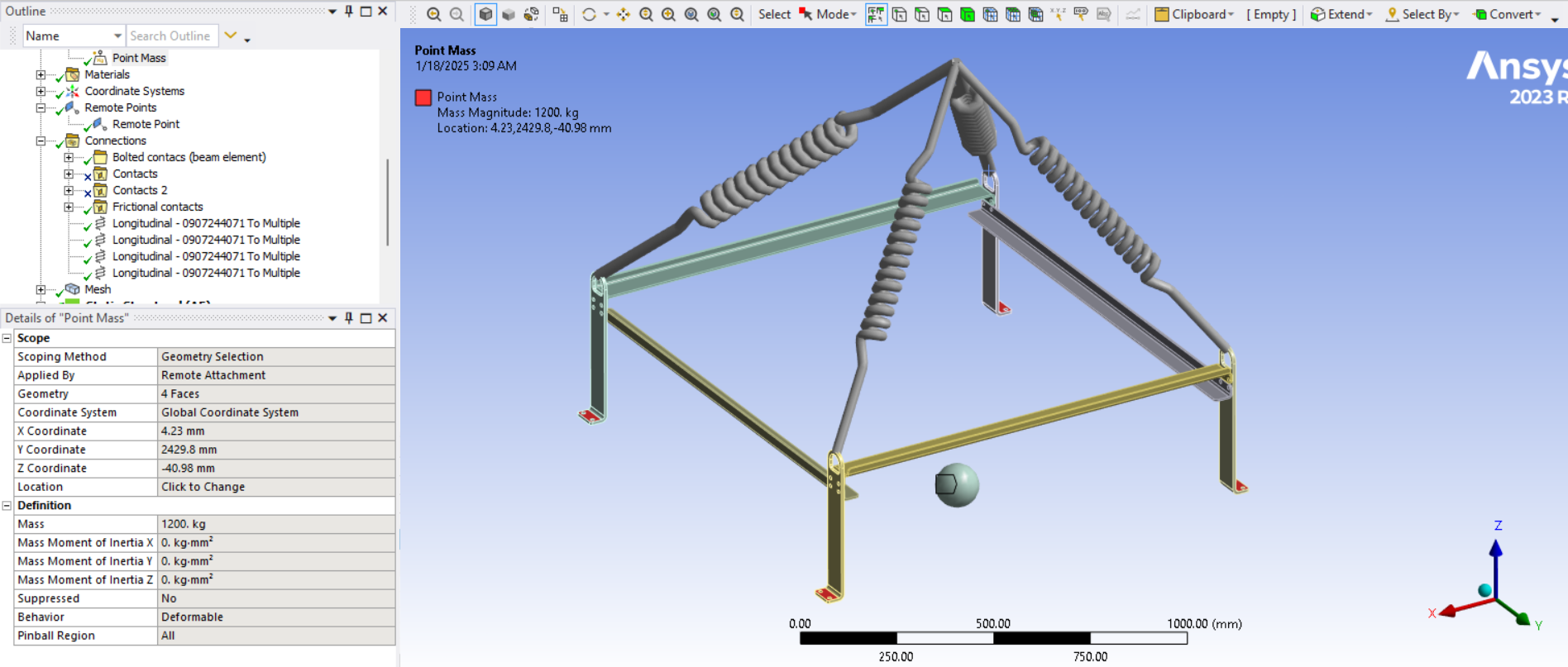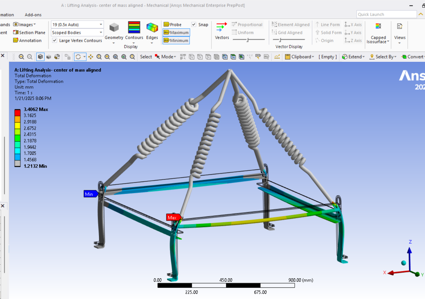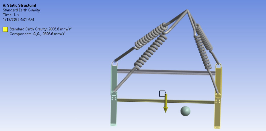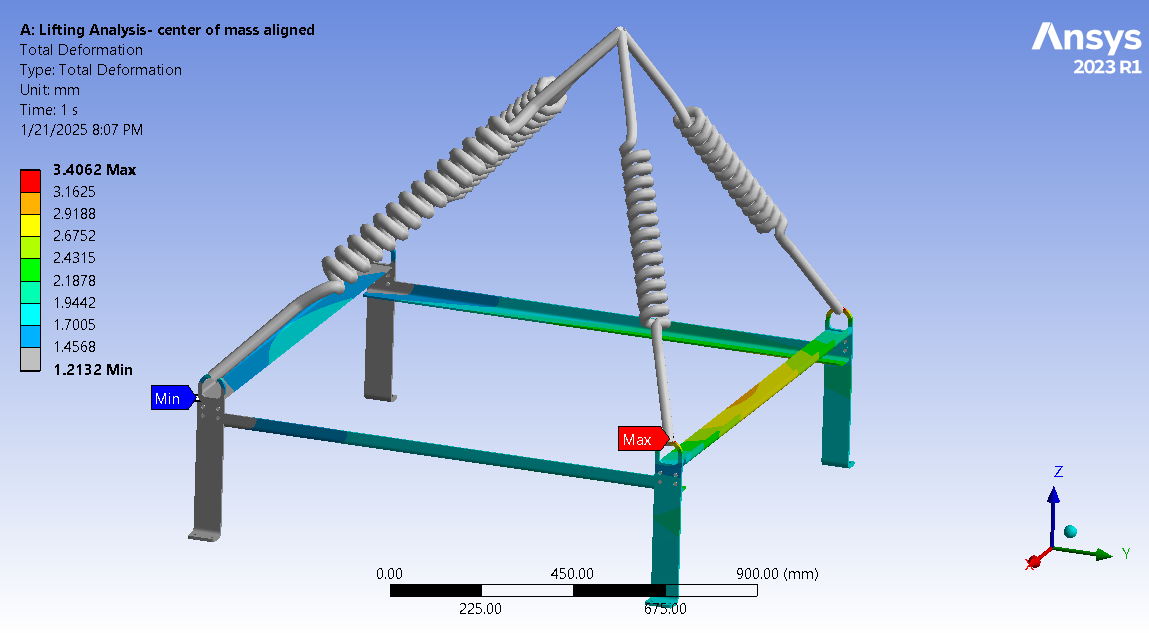 Secondly, I initially attempted the simulation using stiff springs, but I encountered unrealistic results. The boundary conditions were standard Earth gravity, and I also aligned the lifting point with the center of mass of the assembly. I set the stiffnes to 1000N/mm for test purpose as it is not known to me and set the springs preload to 3500N as total weight lifting load is 12000N (1200kg).