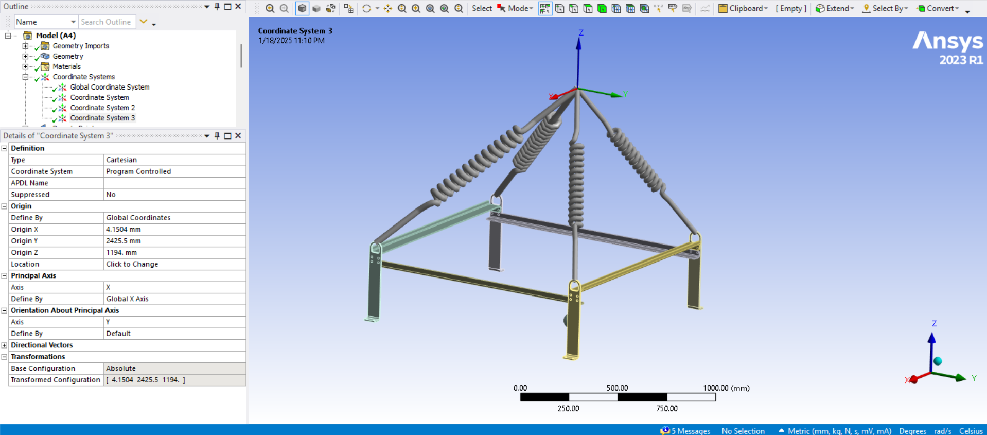 The deformation plot shows the structure has swung over a little and tilted. This is because the lift point is not directly above the Center of Mass of the structure. You can find the global coordinates of the CoM in the Solution Output under the Solution Information folder. Click in the text then type Ctrl-F to find the word CENTER and there you will see the exact coordinates. Edit the coordinates of the origin of the Coordinate System you created to match the X and Y coordinates of the CoM found in the Solution Output, leaving the Z coordinate where it is.