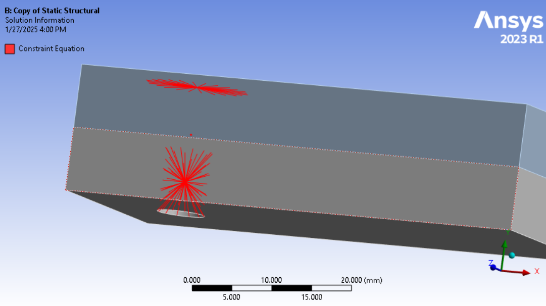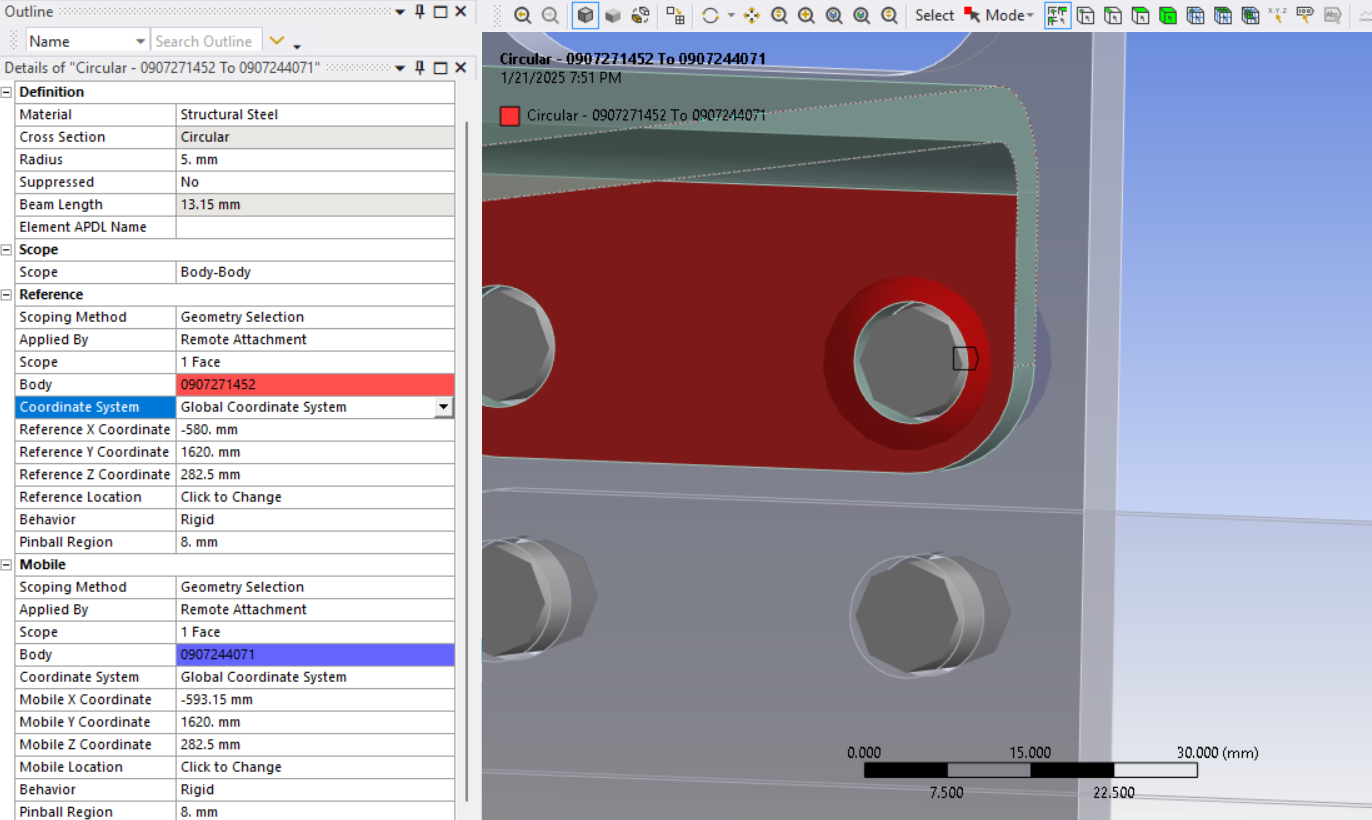 The bolt head or nut does add some stiffness to the hole so deformable is not as good. Finally, each leg of the spider can itself be assigned a beam cross-section and material, which is the beam option. That allows a compromise between rigid and deformable but I don’t usually go with that and prefer to add a solid body nut and bolt to the model if I want higher fidelity to the real conditions.