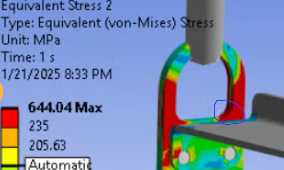 SubscriberAnother approach for evaluating the safety of lifiting structures is to use a non-linear Elastic-Perfectly Plastic (EPP) material model. Another common requirement is the mass of the object being lifted is doubled to provide a margin of safety. Then with the doubled mass and the EPP material model, the output from Ansys is Total Strain which is the sum of Elastic and Plastic Strain. This is compared with the Elongation at Break for the material to compute the Factor of Safety.