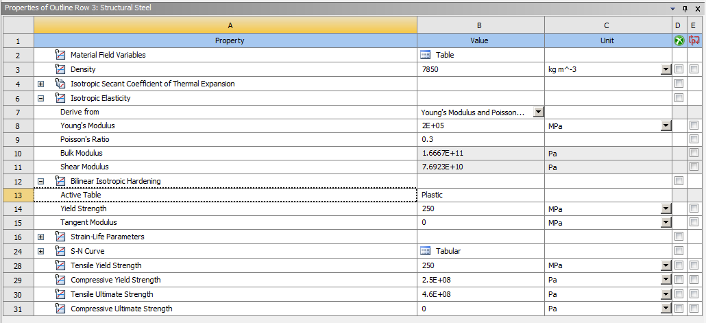 SubscriberOpen Engineering Data and in the Plasticity section of the Toolbox, drag a Bilinear Isotropic Hardening material model and drop it on your frame material. There are only two entries: Yield Strength and Tangent Modulus. Make sure the Units are set properly when you type in the Yield Strength value. The Tangent Modulus = 0. This is a conservative value because it says that once the stress reaches Yield, that element cannot carry any more load. As the load increases, that material just stretches and adjacent elastic material picks up the load increase until it turn plastic.