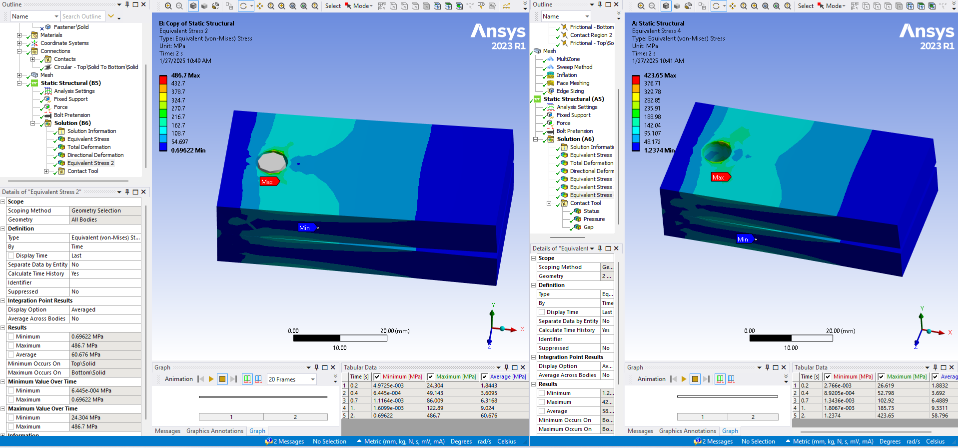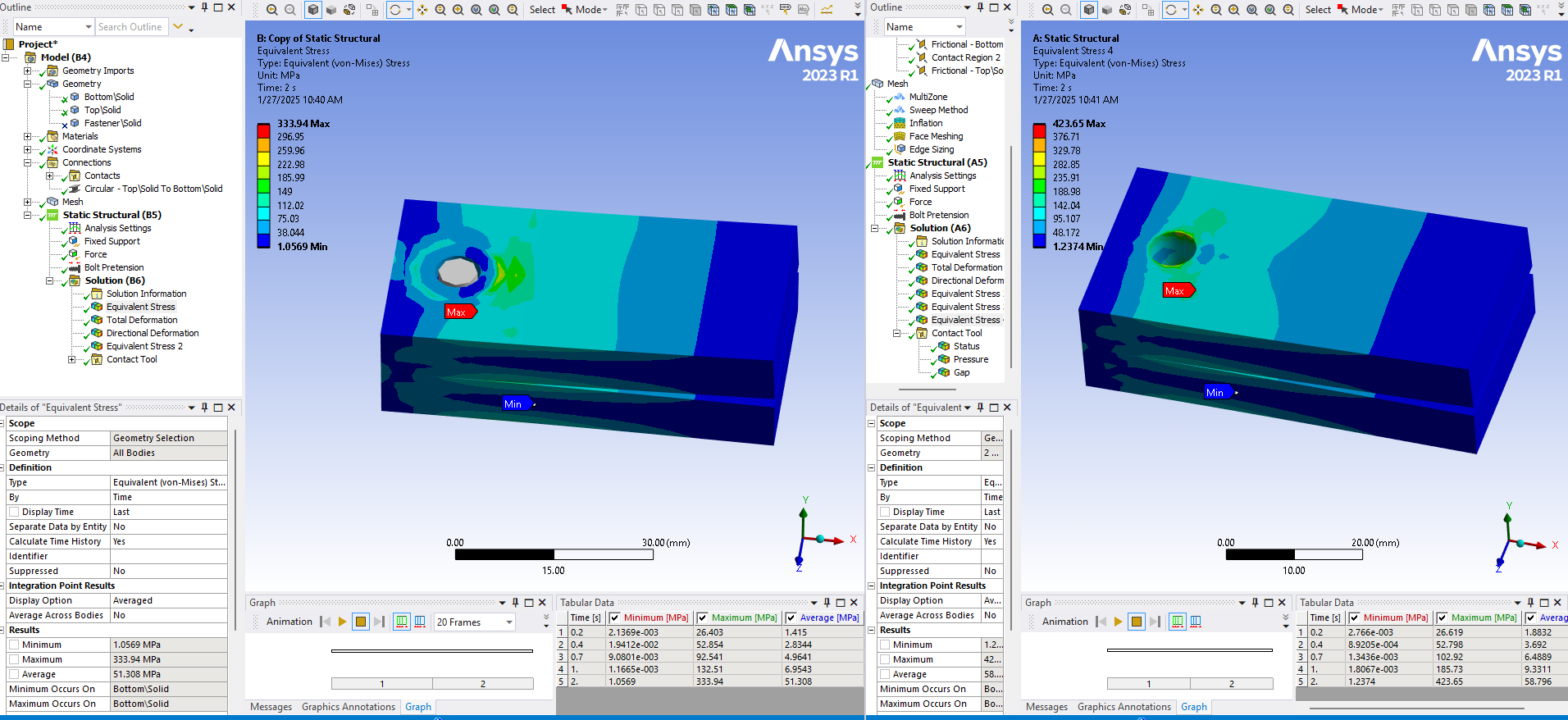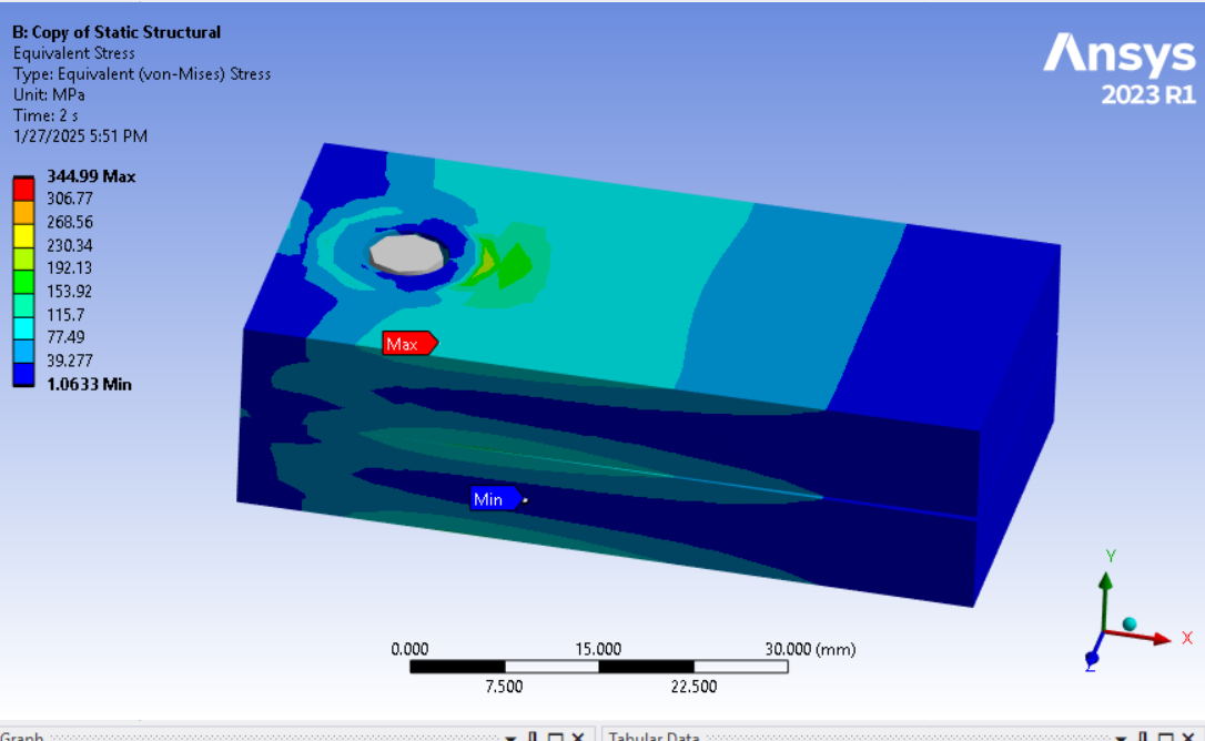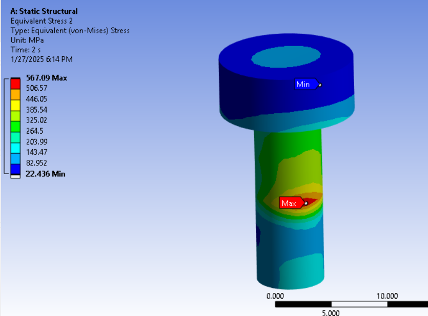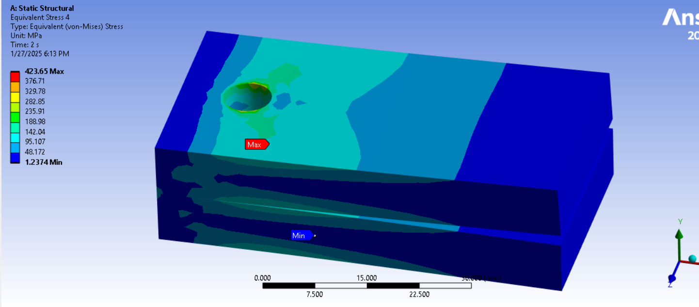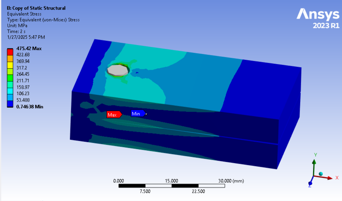 SubscriberIn the 2-step analysis with step 1 being bolt pretension and step 2 being a cantilever load to pry apart the plates, I see evidence that a gap is opening on one side of the bolt hole and causing bending in the bolt which can be seen in the solid bolt shaft. This shows that the bolt preload is inadequate to support the cantilever load. If a gap is allowed to occur in the clamped interface, bending moments will arise in the bolt which should only carry axial tension.Bending moments can lead to fatigue failure of the bolt if the cantilever load cycles on and off. Use the Contact tool in the Solution branch to plot the pressure result on the contact surface between the clamped plates to see if the pressure drops to zero on one side.