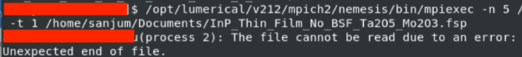 SubscriberI'm trying to run a simulation from the terminal using MPI. I used the following command: /opt/lumerical/v212/mpich2/nemesis/bin/mpiexec -n 5 /opt/lumerical/v212/bin/fdtd-engine-mpich2nem -t 1 /home/sanjum/Documents/InP_Thin_Film_No_BSF_Ta2O5_Mo2O3.fsp