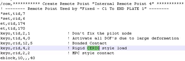 SubscriberIn Workbench, you can write out the input file as I showed above. That may be sufficient to prove CERIG vs RBE3 for rigid vs deformable remote point mass.