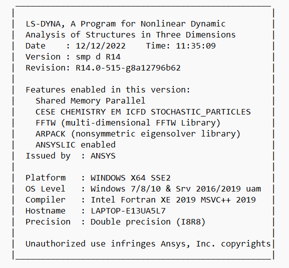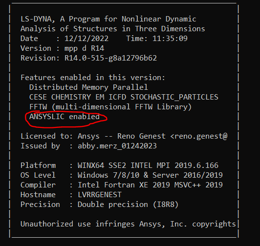 Can you send me the LS-DYNA banner screenshot for the run on Linux with the R14 object file? Is this solver enabled for the Ansys license? See example below: