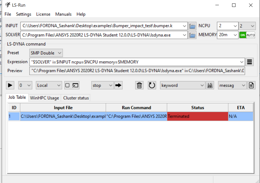 SubscriberI have recently downloaded Ansys LS Dyna student 2020 R12 version and used prepost, but I couldn't use LS run, as it shows the following error..