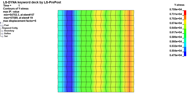 I've done a patch test with uniaxial tensile force under displacement control for shell element formulation 16. The dimension of the plate is 4 in by 4 in and the thickness is 0.25 in. Under the boundary condition, the uniform distribution of the tensile stresses should be obtained. However, this is what I've got when using element 16 and the loading rate is 0.1in/s: