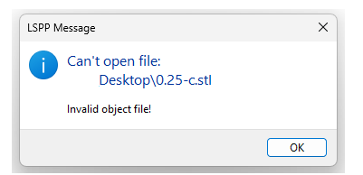 After I changed it back to STL file (*.stl) and selected the file to import, the message that appeared was: