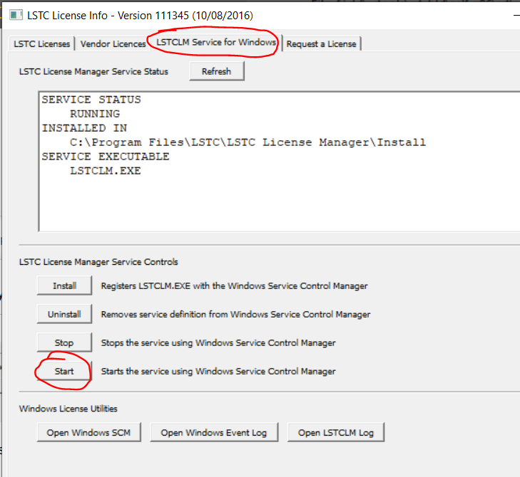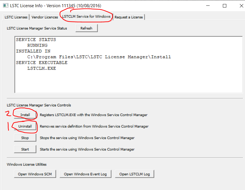 After installing the LSTC license manager on the license server, run the lstclmui.exe as administrator and uninstall and then install the LSTC service for Windows: