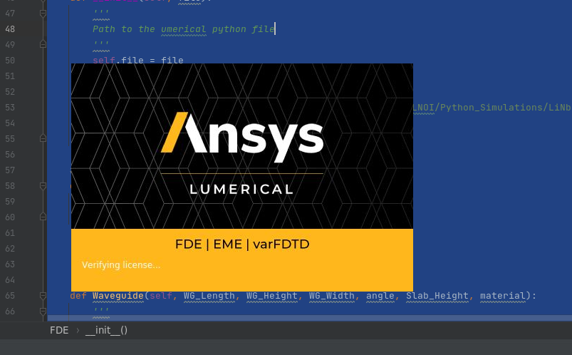i have a problem with Lumerical Python Automations. I was using Lumerical to simulate some MMI and suddenly i get a PyCharm Error, i close PyCharm and start it again and since then when i try to start Lumerical from Python i get stuck on Verifying license... Screen and nothing happend after this. Do anyone know hor to fix this? The OS is Linux CentOS7. And Version of Lumerical is 2021-r1.1. I will attach a photo of the stuck screen. My code to start Lumerica is :