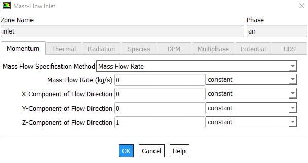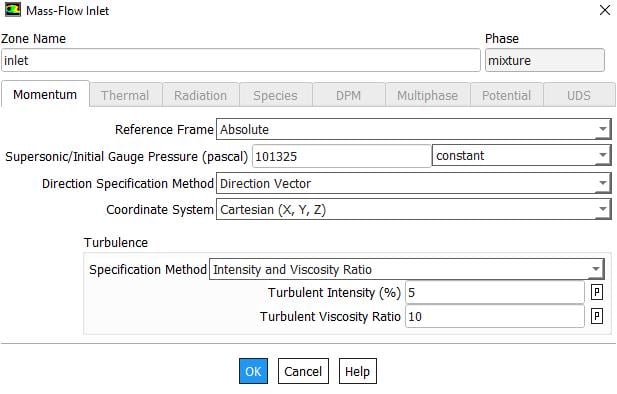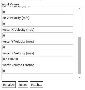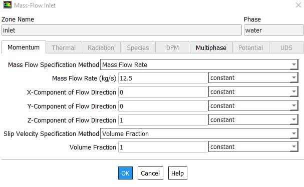 As my boundary condition for the inlet I've chosen a mass flow inlet. I've set 0 kg/s for air and 12.5 kg/s for water with a volume fraction of 1.Â