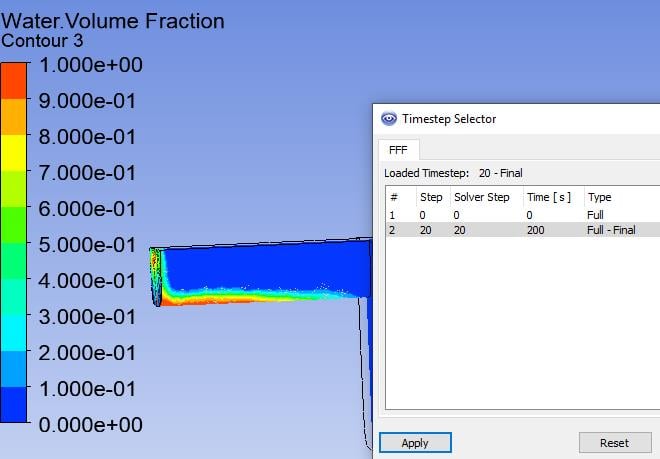 Then there's another thing I don't understand: If I have 12.5 kg/s of inflow and I did run the calculation for 200 s, how is it possible, that the water only reached the point in the graphics (the canal has a length of 1m, so 0.088 m3). With a inflow of 12.5 kg/s of water it should be 2500 kg (or liter) after 200s, which is way more than the volume of the canal. Might be, that I misunderstand the contour "volume fraction".Â