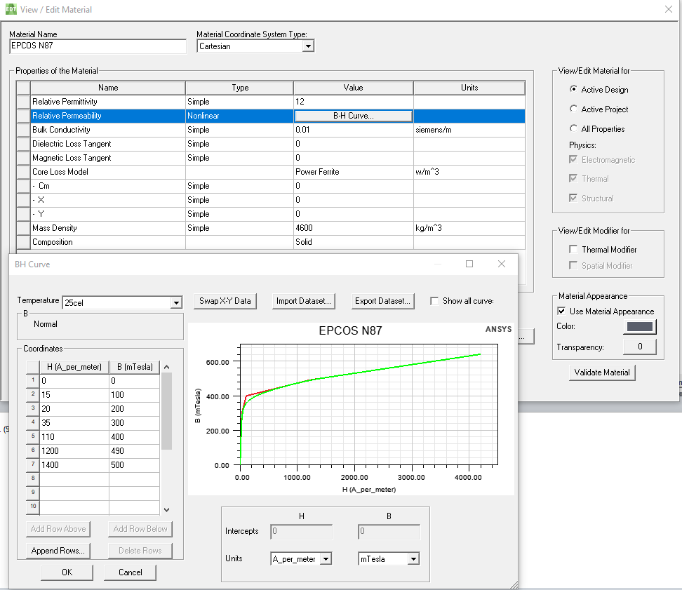 for my master thesis I'm simulating an inductively coupled power transfer system. I started my simulations with the materials included in the system database. After I found out the ferrite there doesn't have a hysteresis loop I looked up a material online and tried adding the loop for my B-H-curve. However, I wasn't able to add a full loop. I decided to try it with only 1 curve, since hysteresis isn't that huge for ferrites anyway.