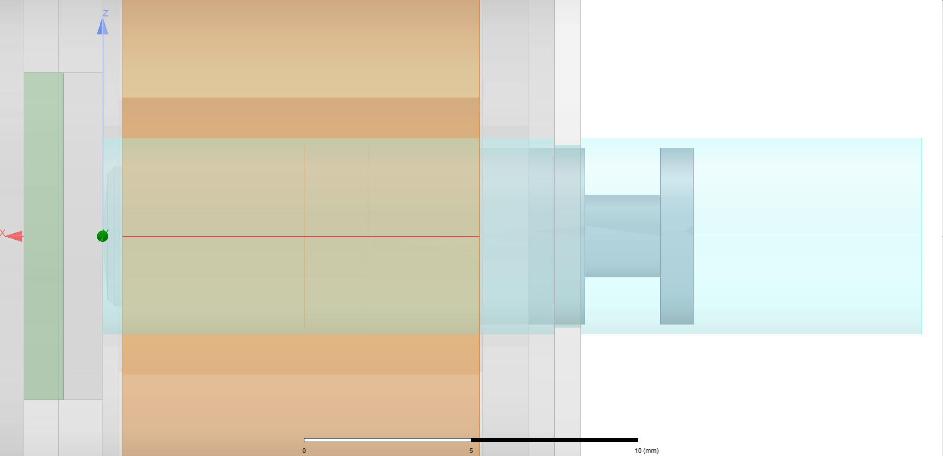 Here's a closer look at the motion band when I apply a Hexagonal polyhedron, to show the relative positiong of the plunger inside of the band. The solenoid is only pushing so I only intend to operate in the -x-axis. One error indicated that the mesh couldn't be solved near the Origin, so I'm curious if that means the band and contents are too close together or maybe the band is too close to the other objects. (It returned some coordinates that were all <1mm from 0,0,0).