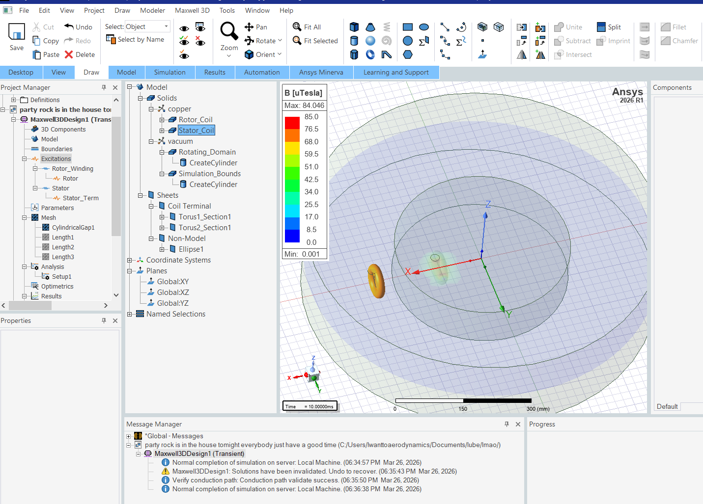 I am building a sensing coil that rests on a rotating steel shaft that interacts with a stationary coil carrying an arbitary current, and I am trying to determine the flux linkage and induced EMF based on some different currents, rotation angle and speed. I have set up a realistic simulation but couldn't get any flux linkage in the rotor coil. I then made a very simple model with just two torus', one in a rotating domain. have set up both as windings and the stator has a current of 0A and the rotor with 500mA, 5 turns each. Simulating without the rotating domain is about what you'd expect