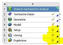 maybe a simple question, but I was not able to find an answer yet: When I work through a system, the different categories (engineering data, geometry, model, ...)  ususally get a green tick, which means that this category is fully defined and calculated, right? A question mark indicates, that there is missing some information. And a flash means, that it is fully defined, but not calculated yet.