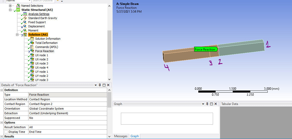 I am trying to get the force rxn at a certain face (Face 2 in the following picture). I have a simple structure, a cubic PDMS joint (that between points 2 and 3) is placed between two Silicon beams. Whenever I try to choose face 2, it gives an error (a question mark next to 'Force Reaction' [see in picture]).