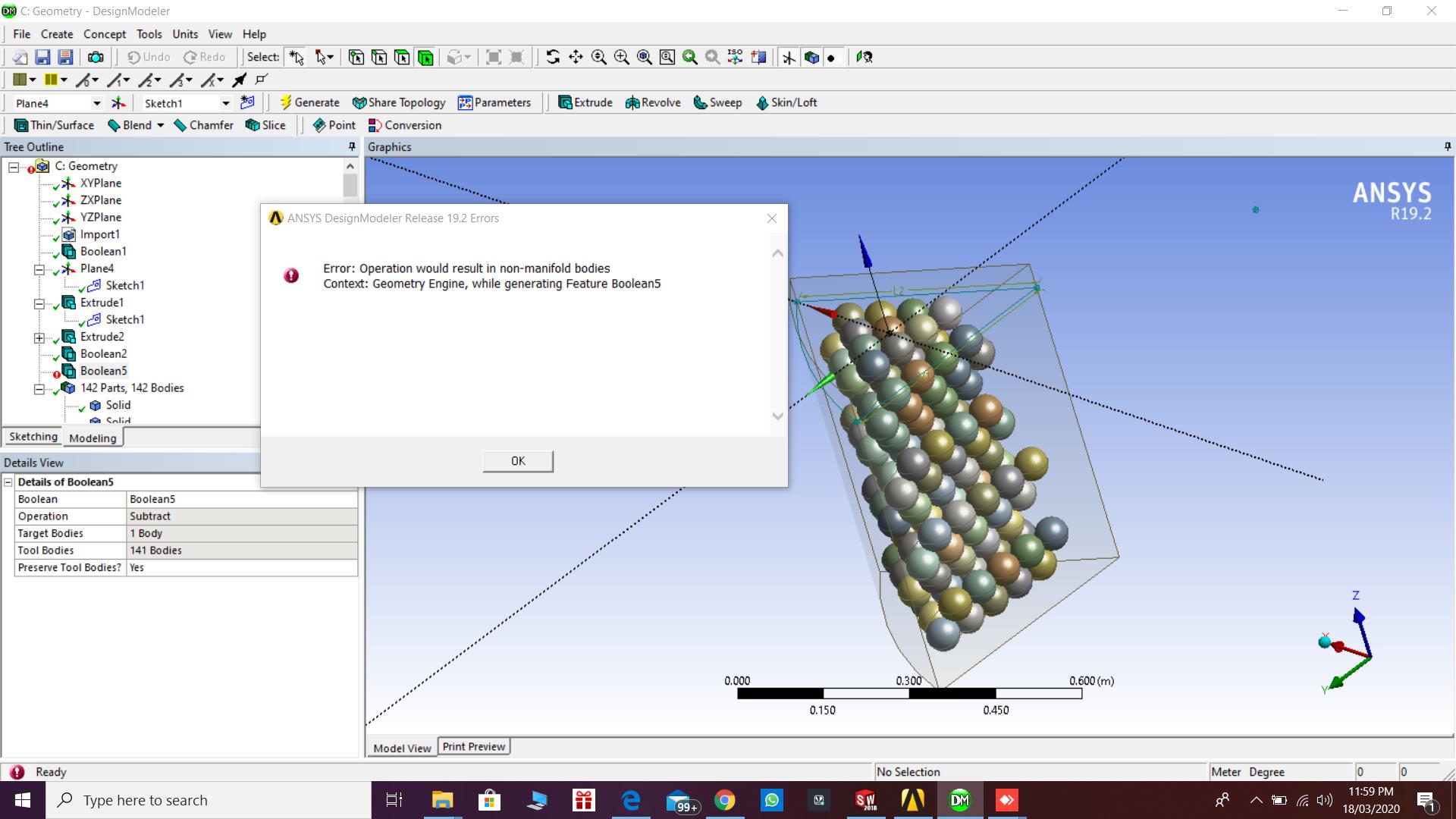 I've attempted to mesh the balls and define the fluid flow domain(by trying to create a Boolean around the entire cylindrical geometry and subtracting the balls from the cylindrical geometry)Â All these attempts failed. I then realized that the balls needed to be distinct without any contact with each other. Thus,i gave a gap of 0.1 mm between each ball.