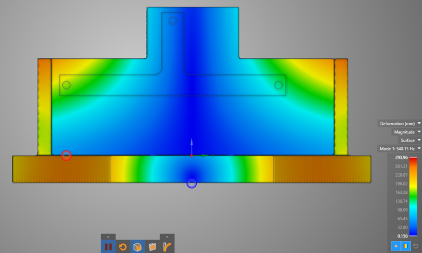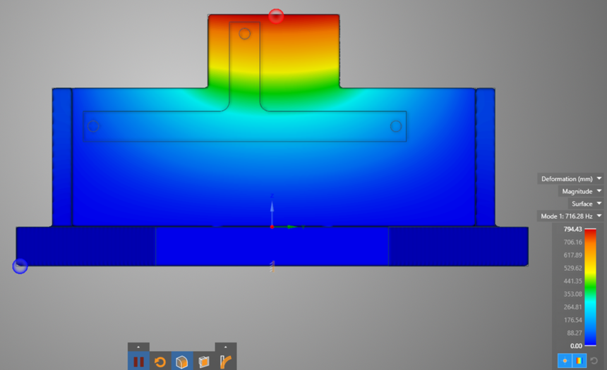 This is what I would expect to see; excitation at the top. Notice the legend now shows 794mm. Again, it's not possible to have that much deformation. There should only be approx. 0.8mm at this frequency(I ran this in another software.) It seems to me there should be value at the blue and red circles. -