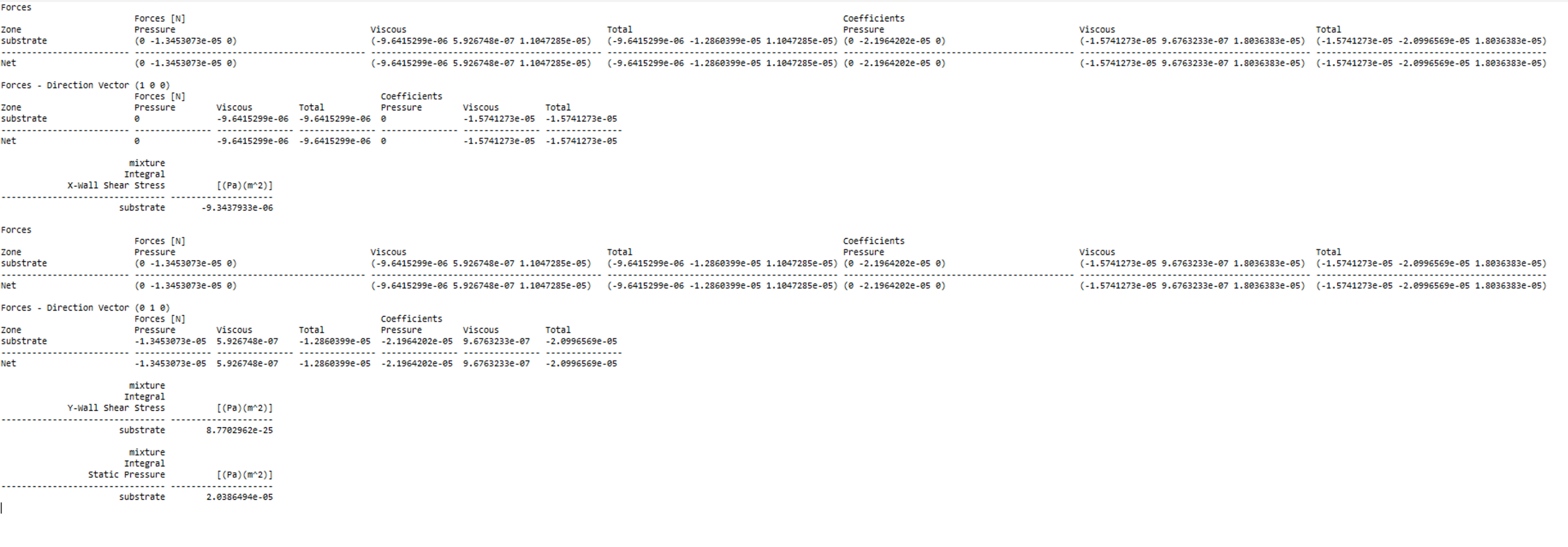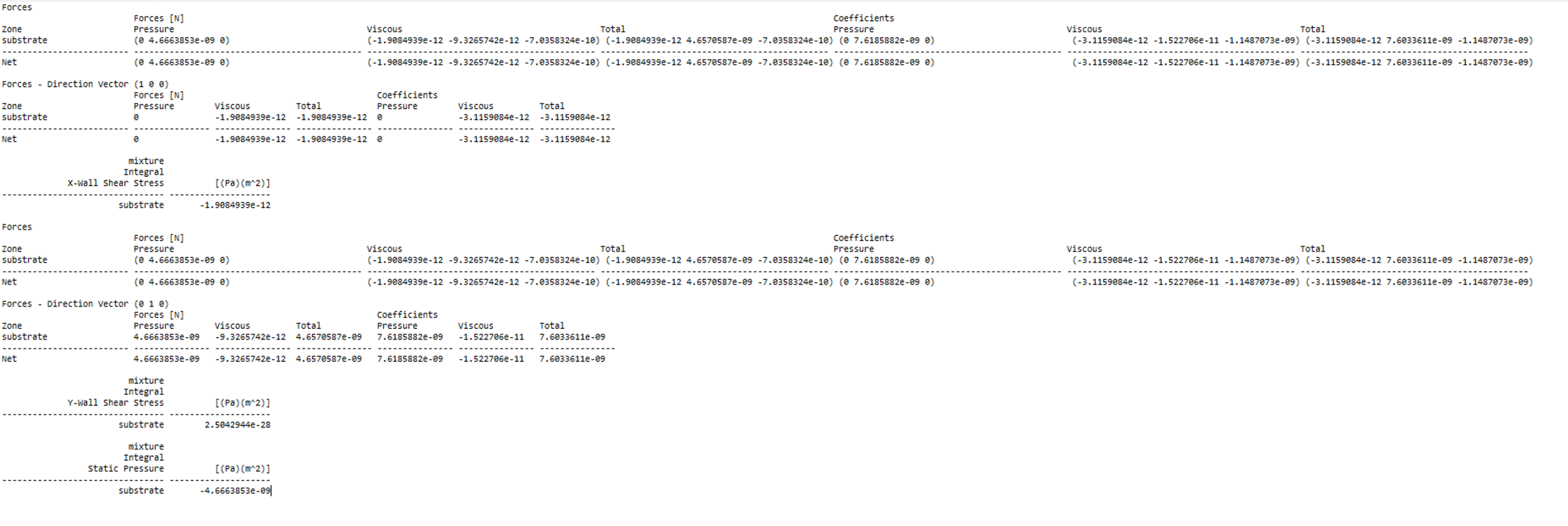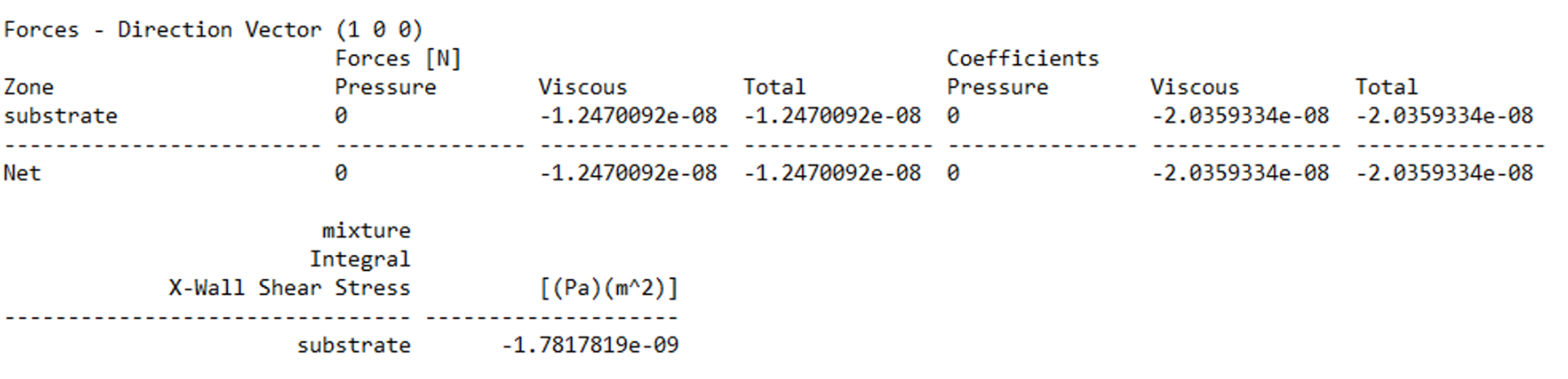 SubscriberThe mismatch is gone when wall adhesion or surface tension modelling is disabled. But the integral of y-wall shear stress (E-27, almost zero) is still different from the viscous component of the force report in the (0 1 0) direction (non-zero).