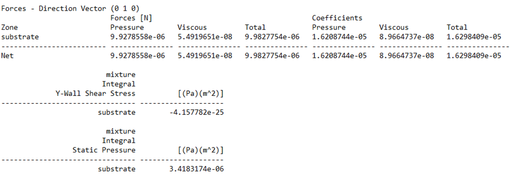 Here, with only one phase (vapour) in contact with the bottom wall, integral of x-wall shear stress is exactly the same as the force report in (1 0 0). The integral of static pressure is also exactly the same as the pressure component in force report in (0 1 0). However, although the integral of y-wall shear stress is almost zero, the viscous component in force report in (0 1 0) is non-zero, or at least much larger.