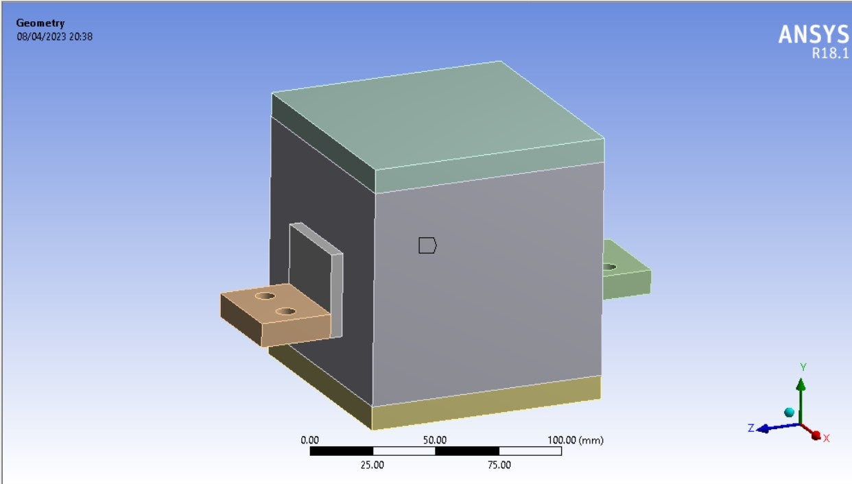 Add a solid body inside the container to represent the fluid. Use shared topology so the fluid is connected to the container. Assign a fluid material to the body. Mesh the fluid body. What element shape was created?  If Quadratic Tet elements, assign FLUID221 elements to that body. If Linear Hex elements, assign FLUID30 elements to that body. Solve the model using Modal Acoustics. Does the fluid completely fill the container or is there a free surface?