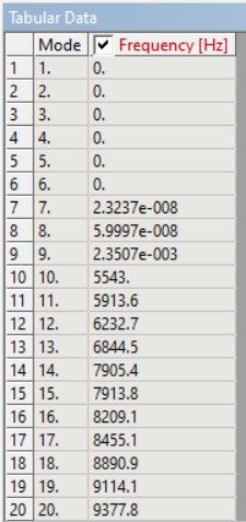 I have done a modal analysis of a container in which a fluid is considered as a point mass. This point mass is defined using free standing remote point. Free-free modal case is considered. After calculation for 20 modes, I find out that 6 modes are zero and additional 7th, 8th and 9th mode frequencies are almost zero. Why the 7th, 8th and 9th modes are also zero when first six modes capture rigid body motion? Following are the snapshots of the analysis.